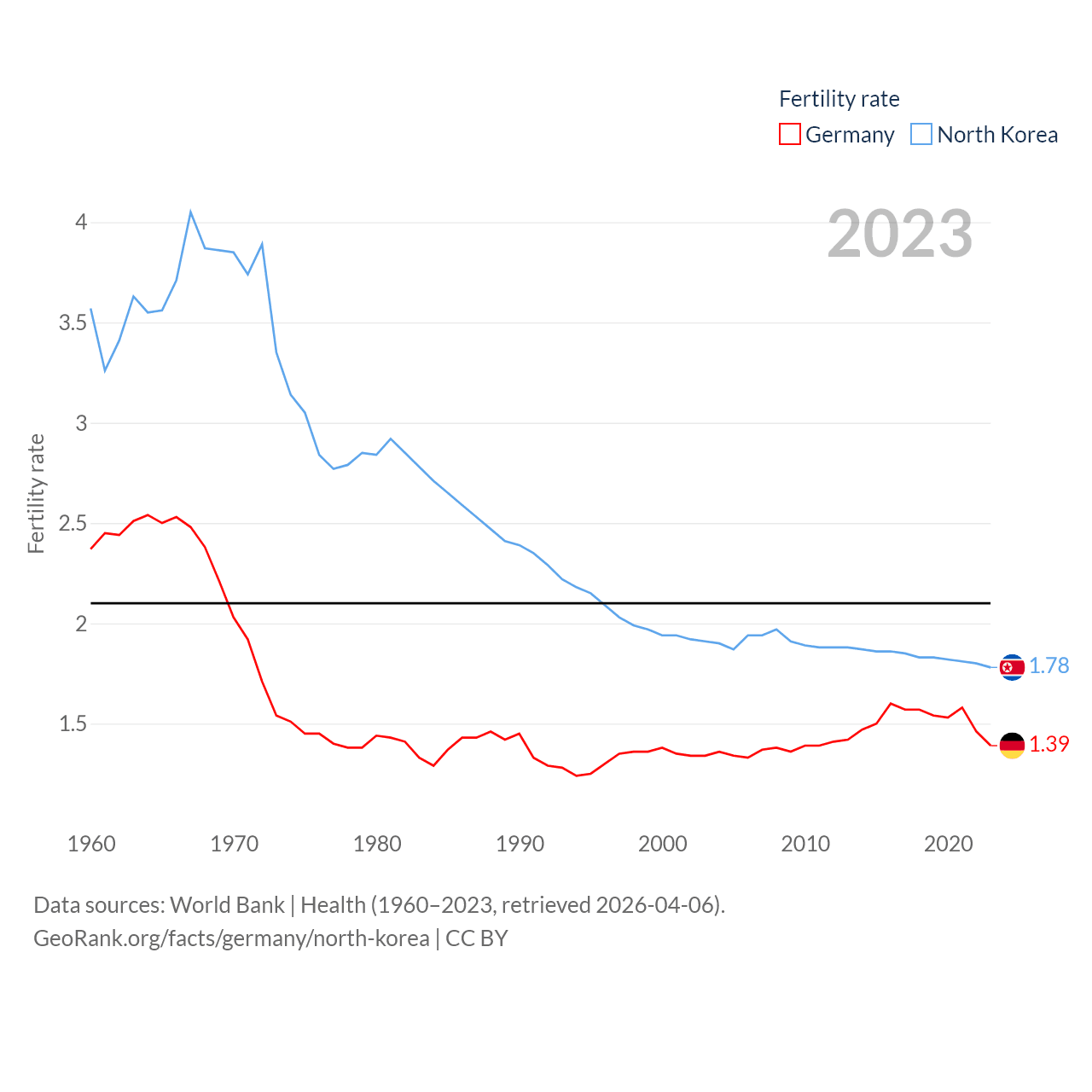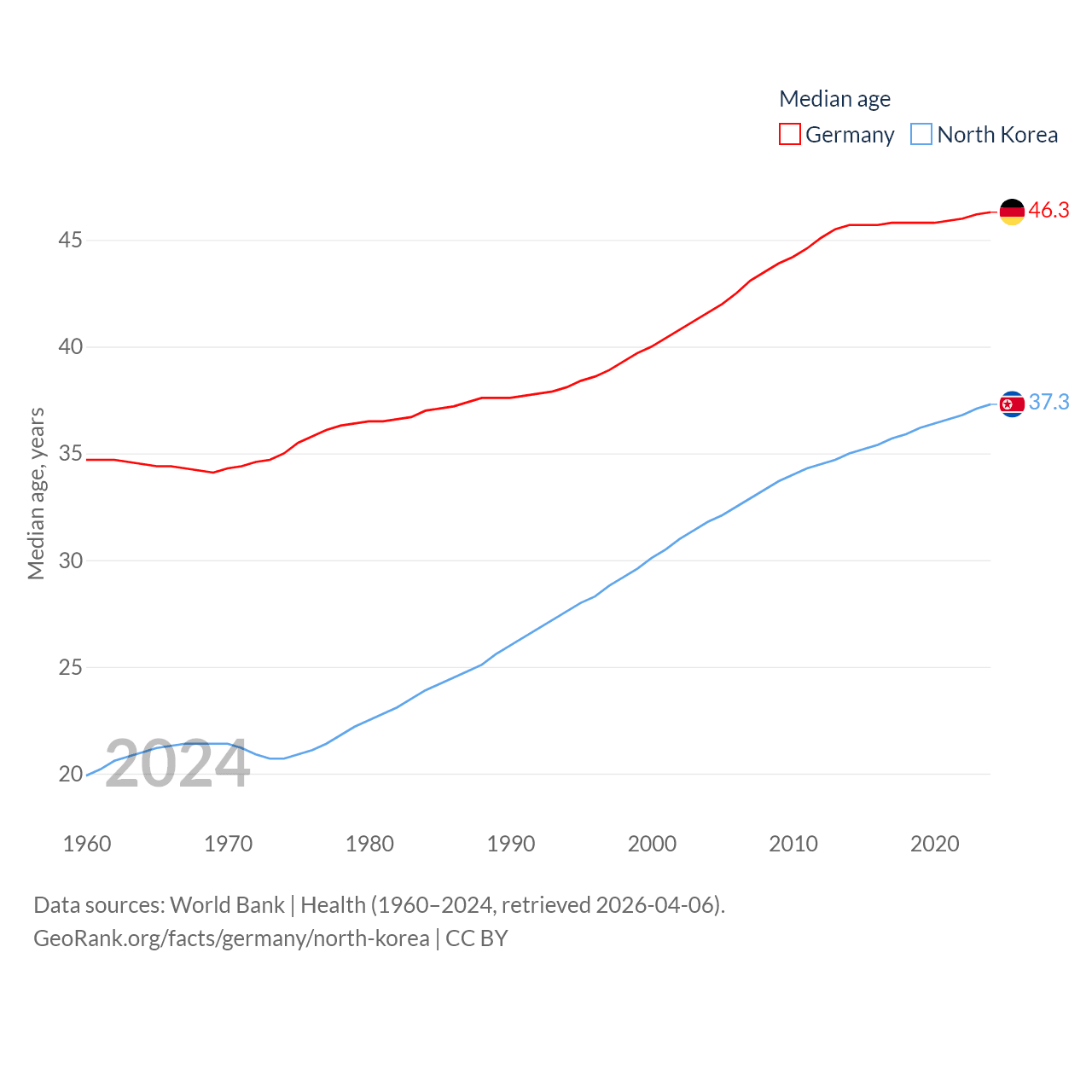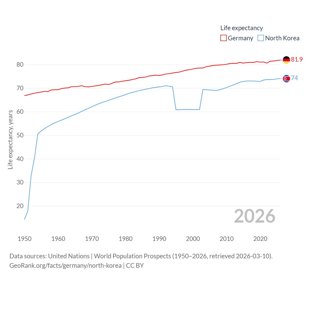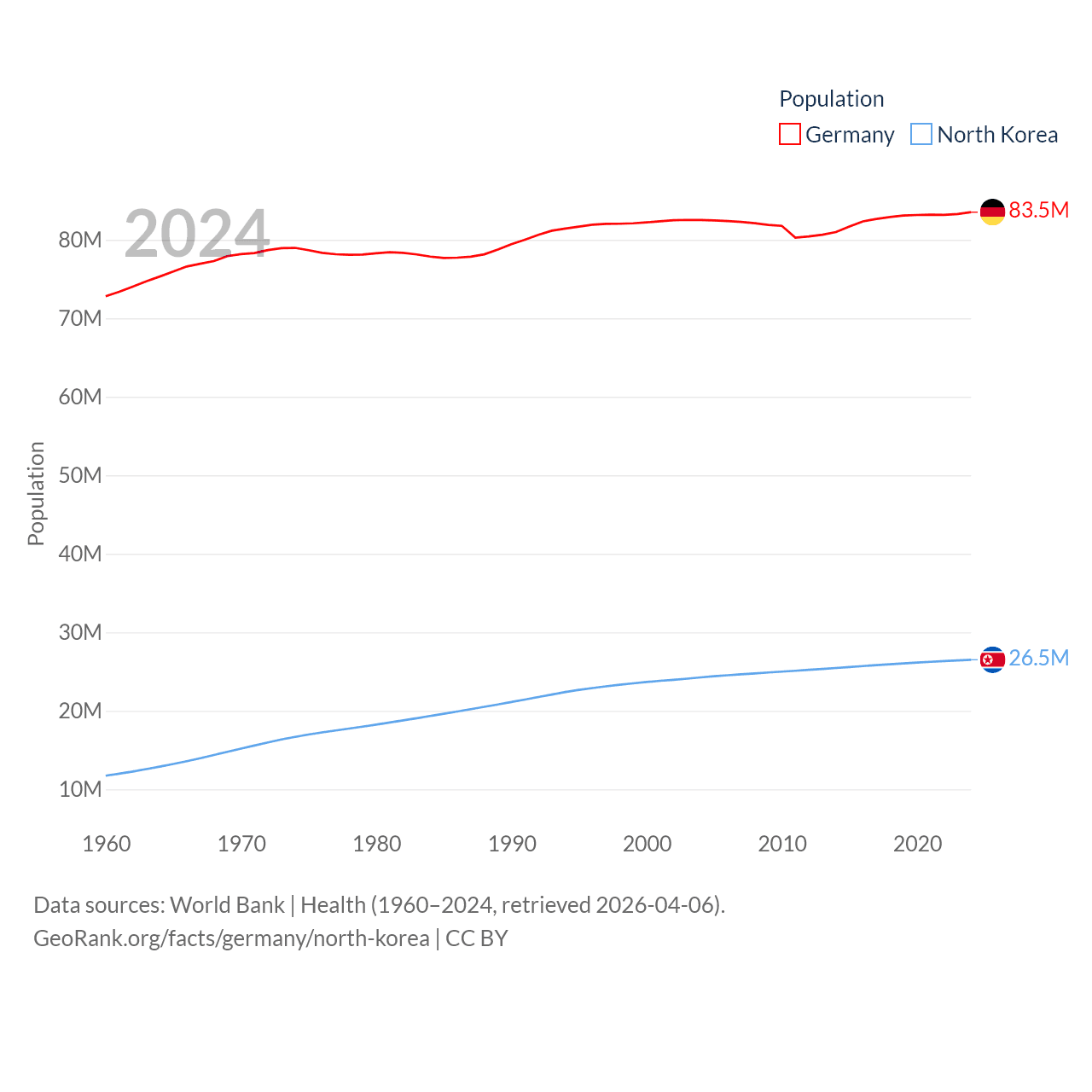 Germany has a population of 83.5M (ranked 19/197), compared with 26.5M in North Korea (ranked 56/197). Germany's land area is 134,916 sq mi versus 46,491 sq mi for North Korea (ranked 63rd vs. 97th).