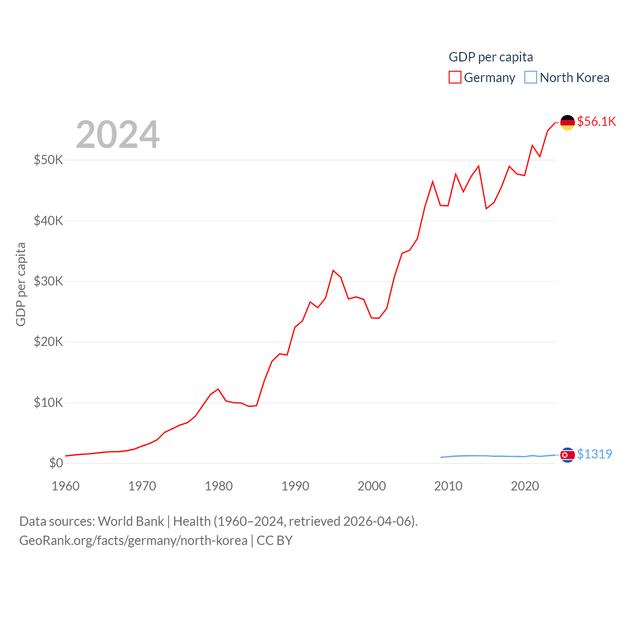 By GDP, Germany ranks 3/197 ($4.69T) and North Korea ranks 106/197 ($34.9B). By GDP per capita, Germany ranks 19/197 ($56,104), while North Korea ranks 168/197 ($1,319).
