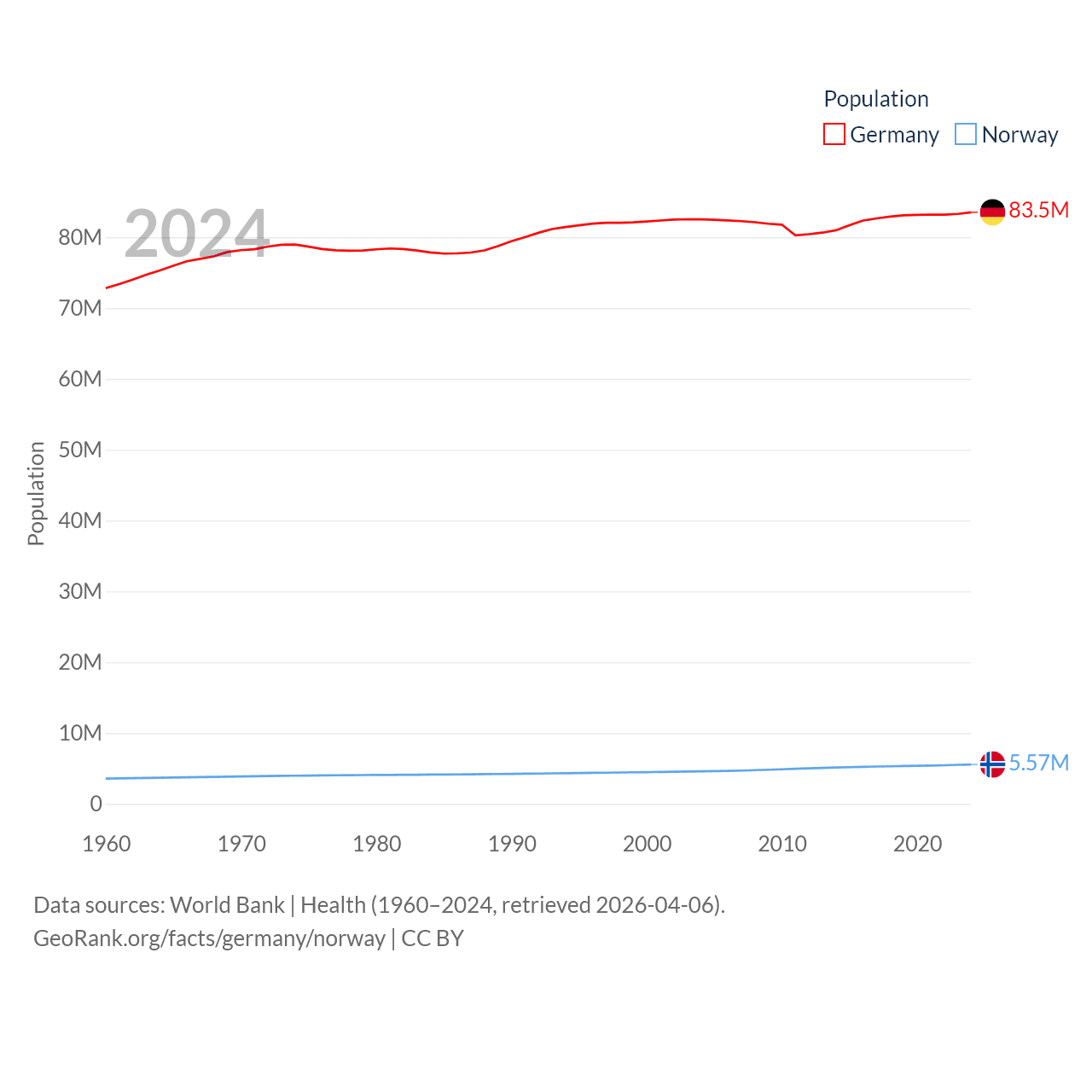 Germany has a population of 83.5M (ranked 19/197), compared with 5.57M in Norway (ranked 118/197). Germany's land area is 134,916 sq mi versus 140,645 sq mi for Norway (ranked 63rd vs. 62nd).