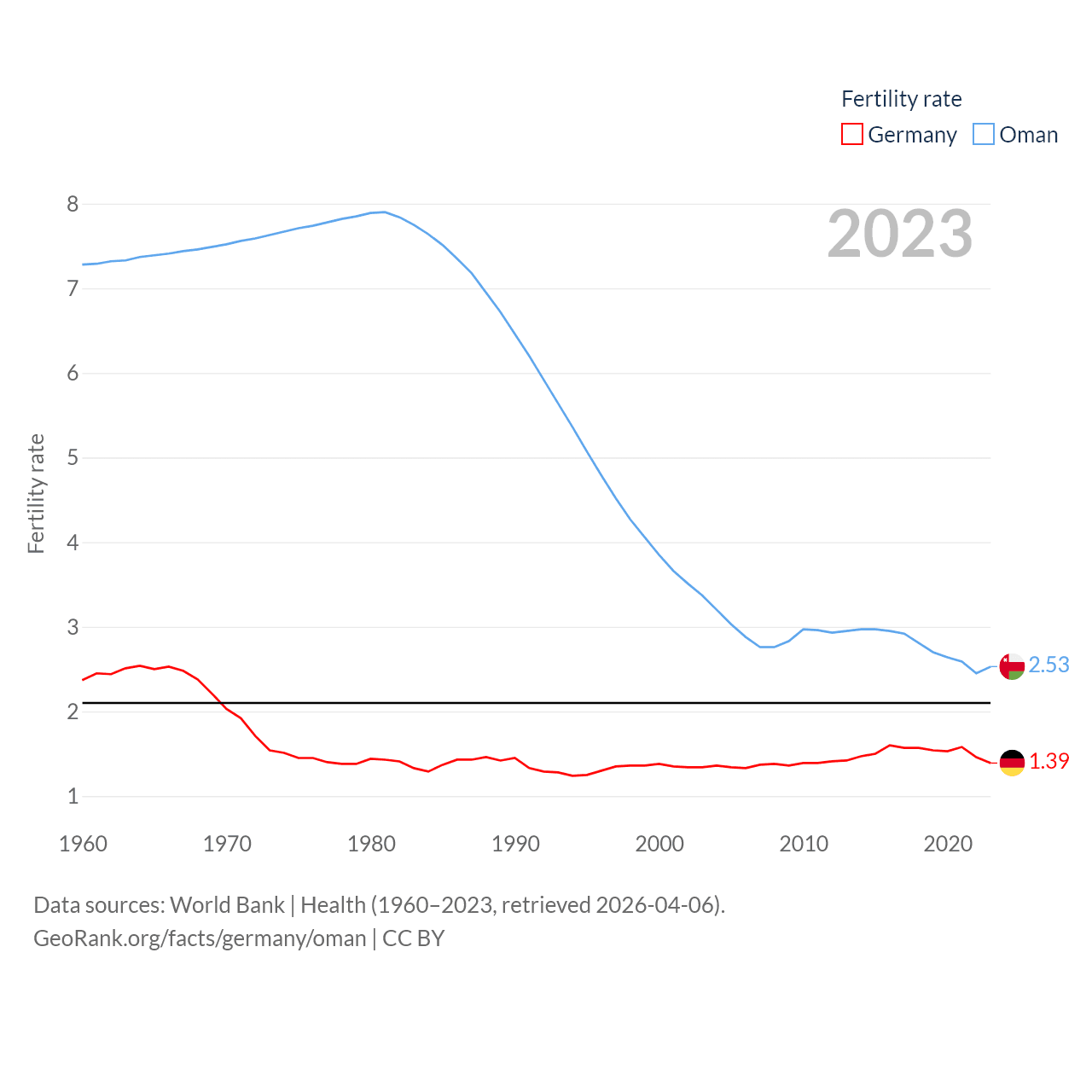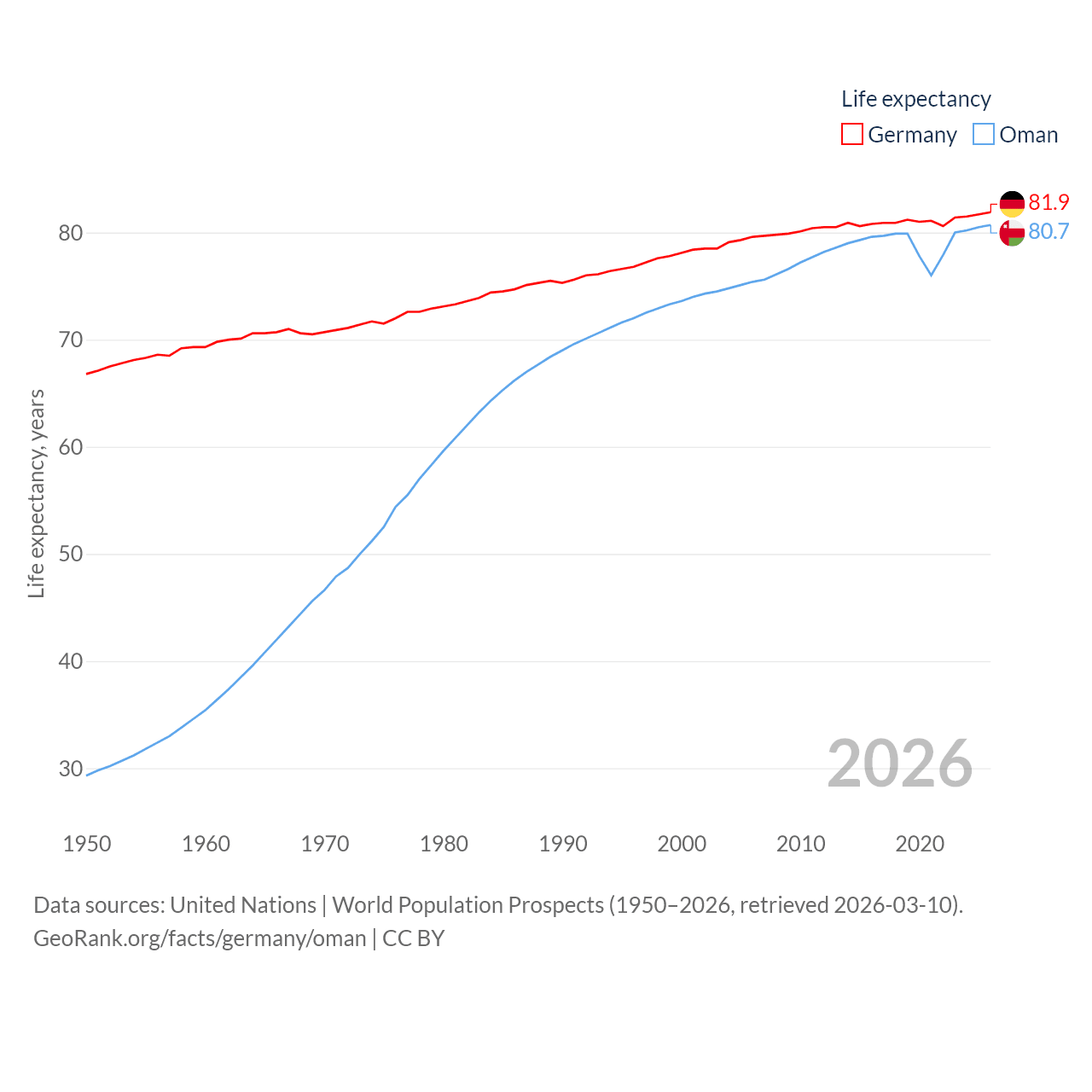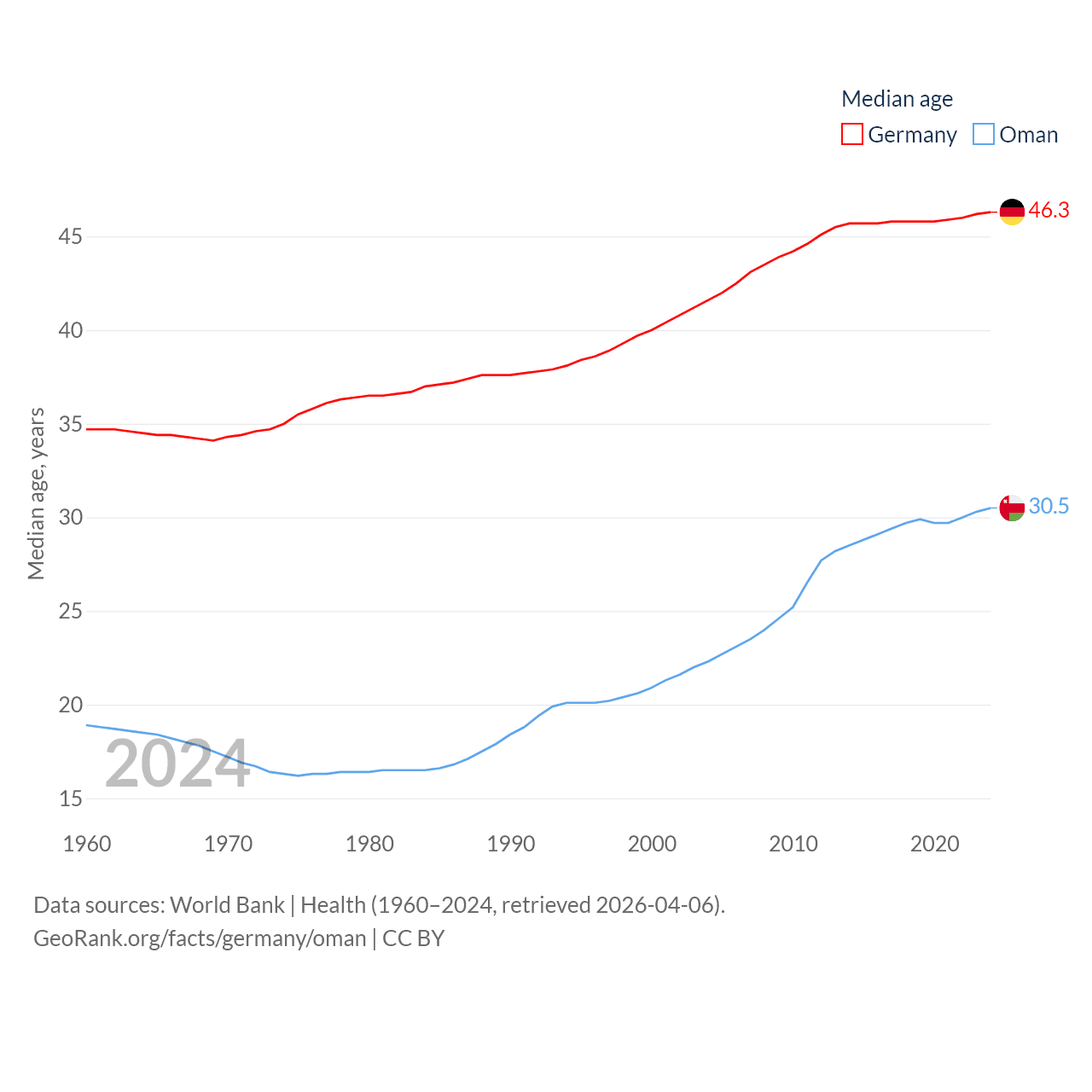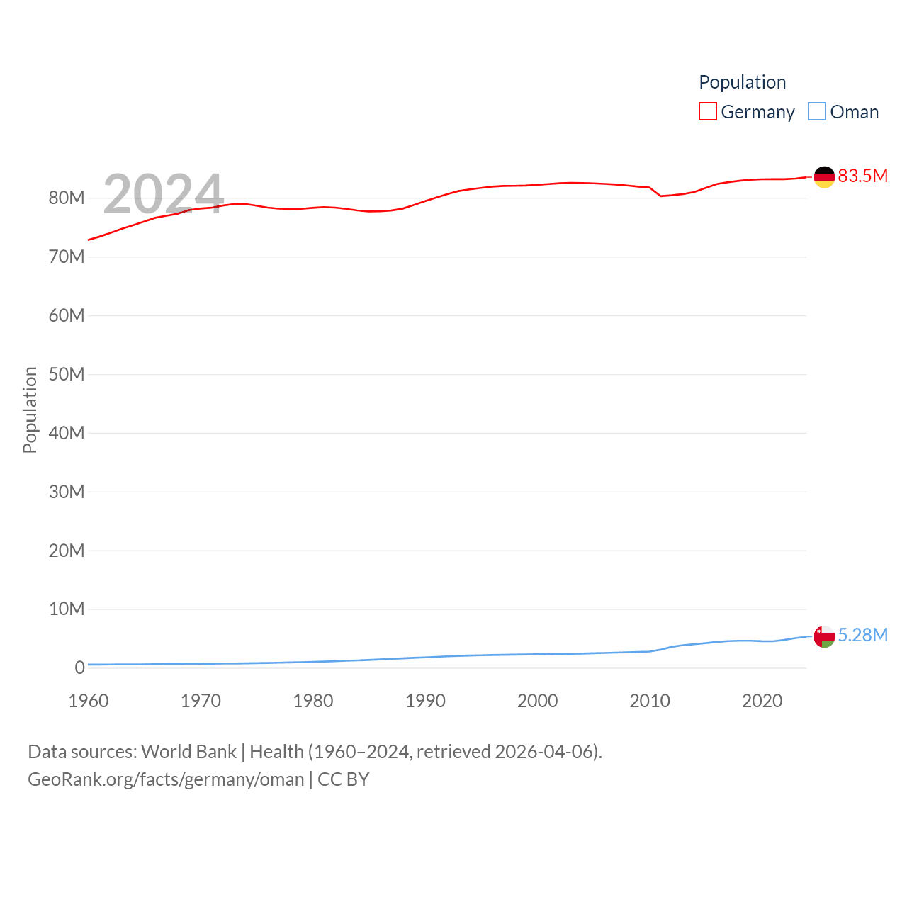 Germany has a population of 83.5M (ranked 19/197), compared with 5.28M in Oman (ranked 124/197). Germany's land area is 134,916 sq mi versus 119,499 sq mi for Oman (ranked 63rd vs. 68th).