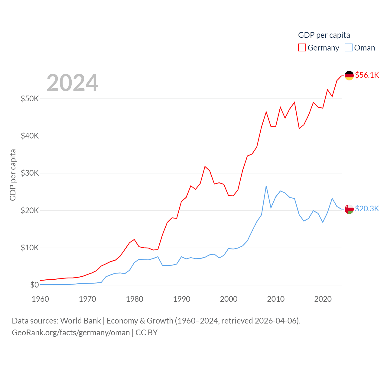 By GDP, Germany ranks 3/197 ($4.69T) and Oman ranks 70/197 ($107B). By GDP per capita, Germany ranks 19/197 ($56,104), while Oman ranks 57/197 ($20,285).