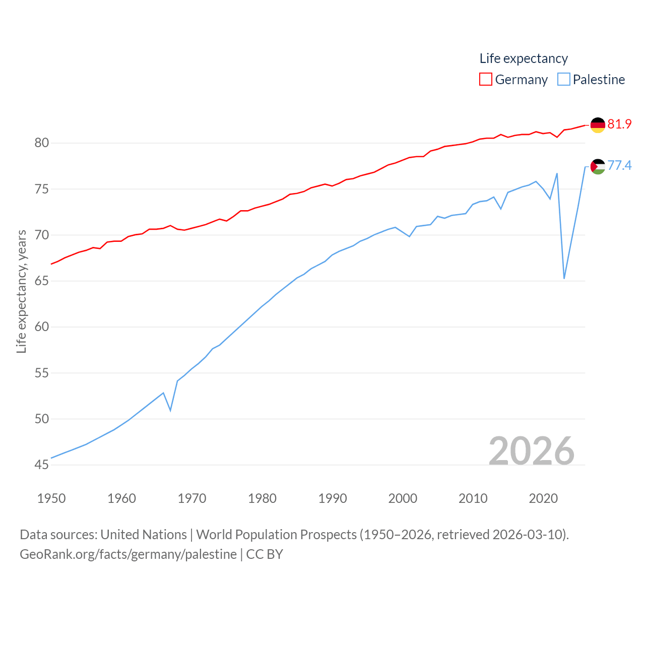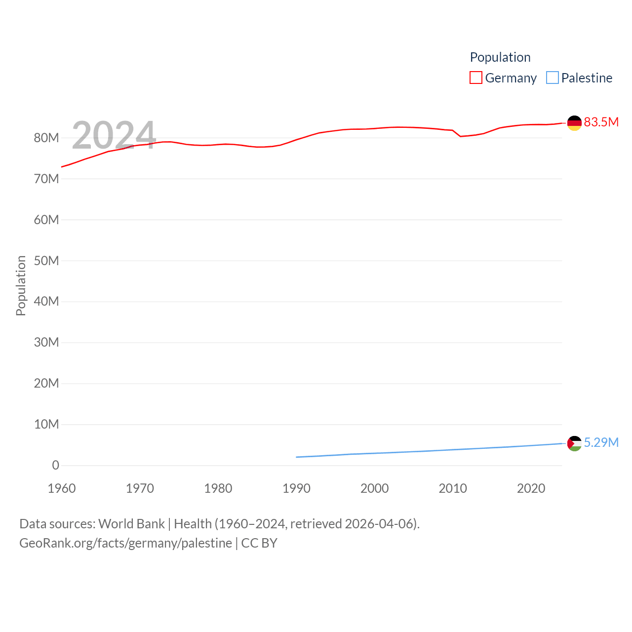 Germany has a population of 83.5M (ranked 19/197), compared with 5.29M in Palestine (ranked 122/197). Germany's land area is 134,916 sq mi versus 2,326 sq mi for Palestine (ranked 63rd vs. 164th).