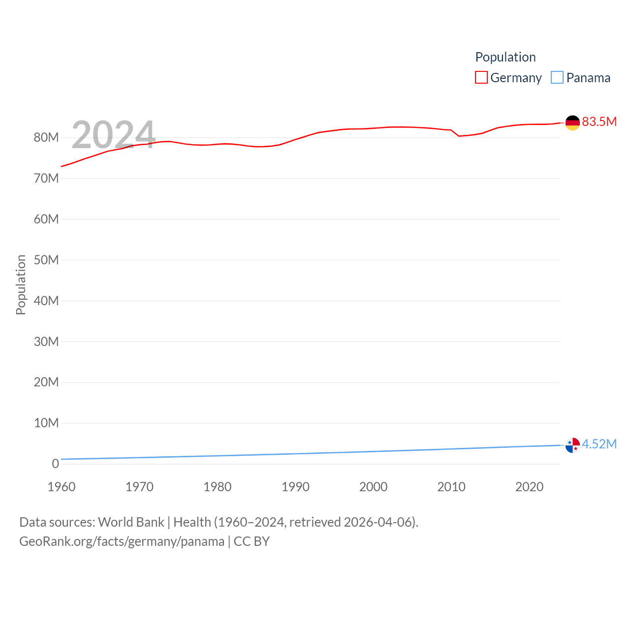 Germany has a population of 83.5M (ranked 19/197), compared with 4.52M in Panama (ranked 128/197). Germany's land area is 134,916 sq mi versus 28,641 sq mi for Panama (ranked 63rd vs. 115th).