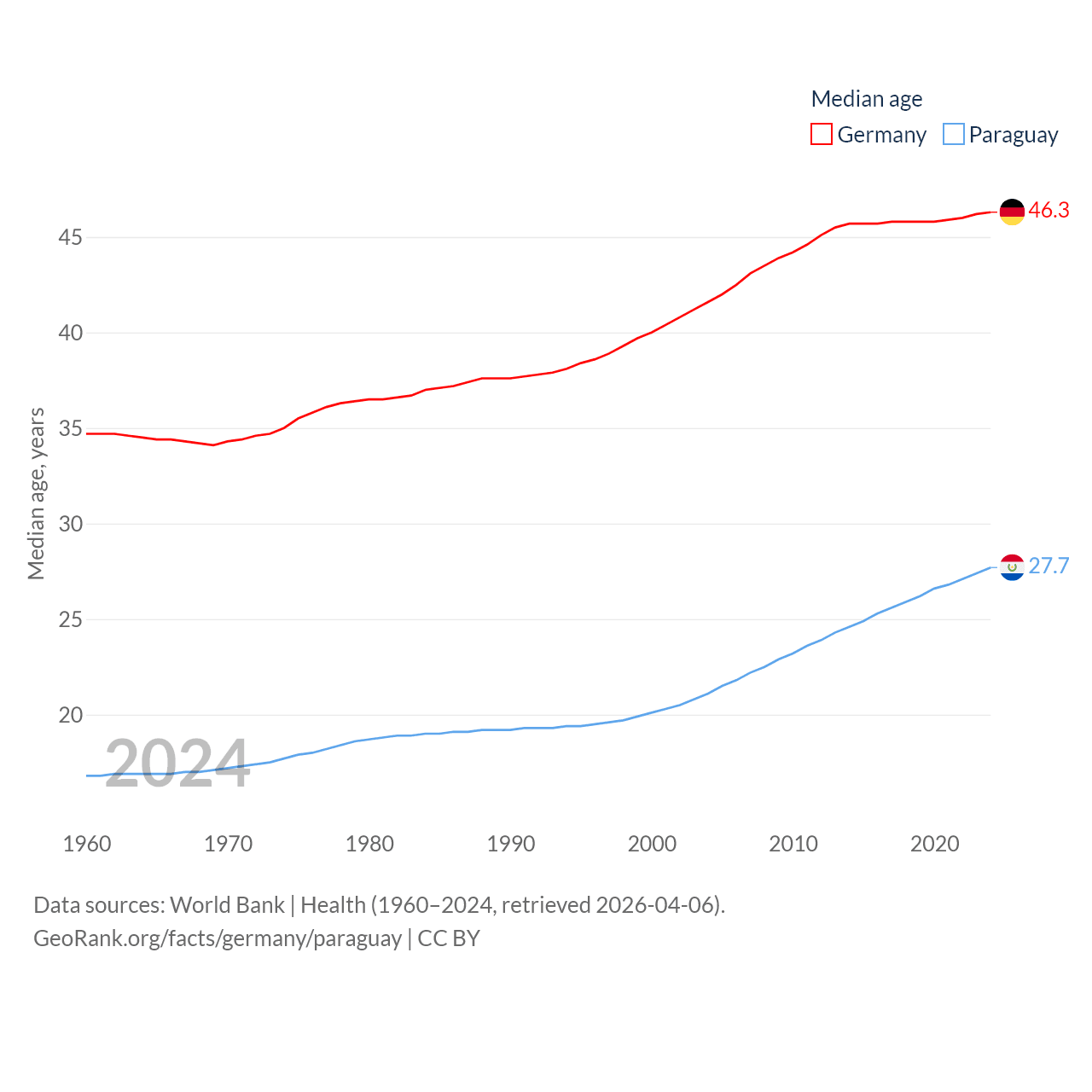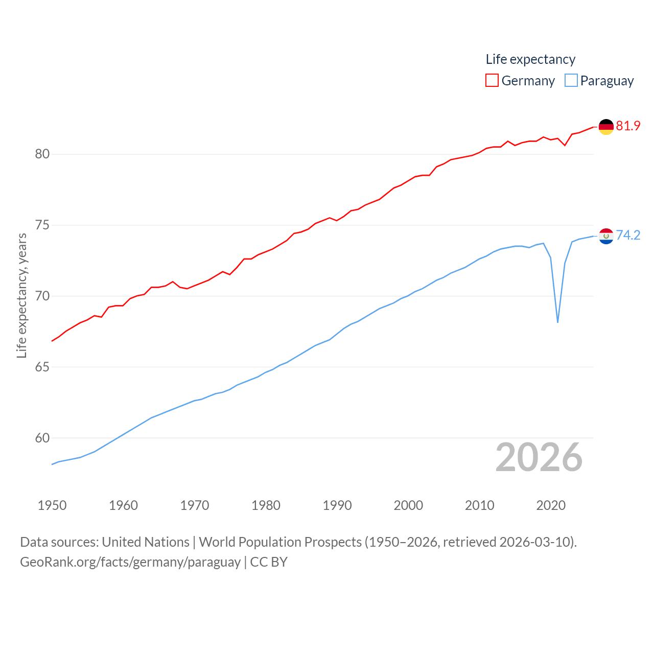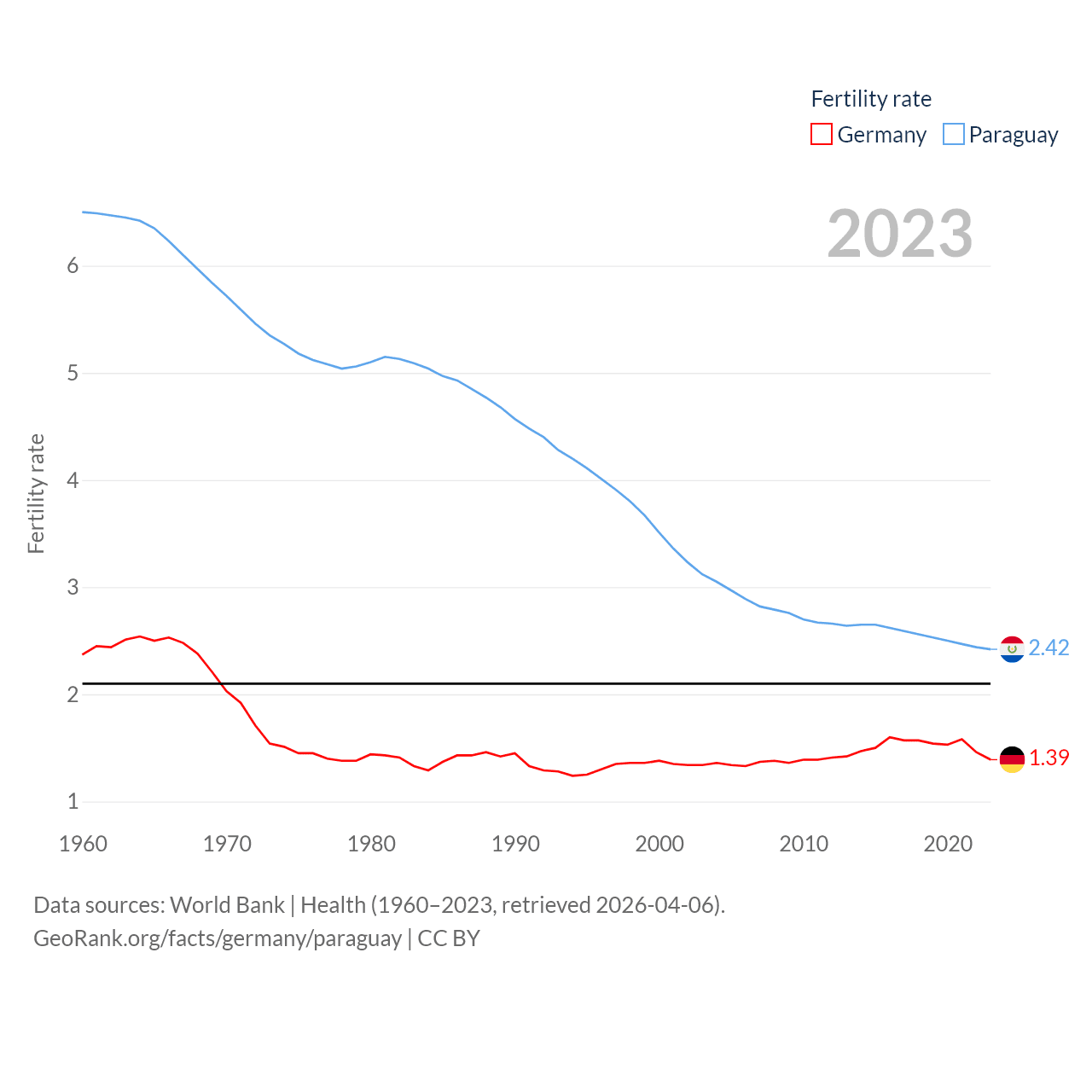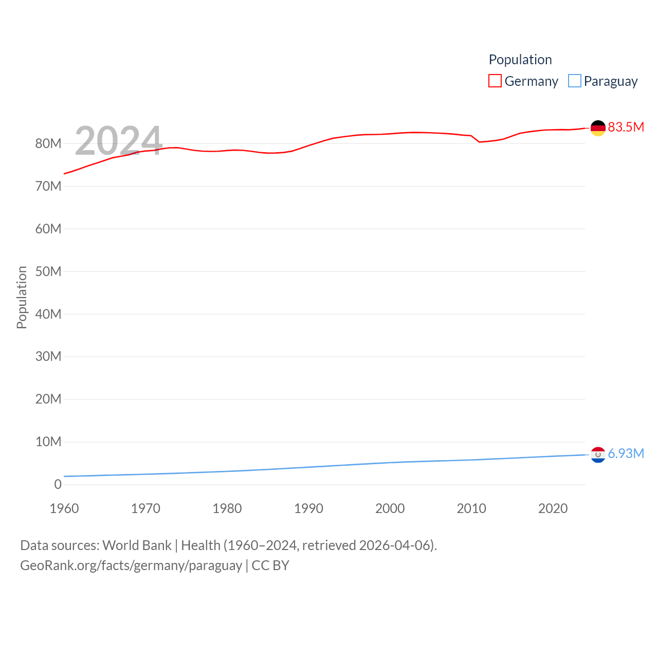 Germany has a population of 83.5M (ranked 19/197), compared with 6.93M in Paraguay (ranked 107/197). Germany's land area is 134,916 sq mi versus 152,901 sq mi for Paraguay (ranked 63rd vs. 59th).