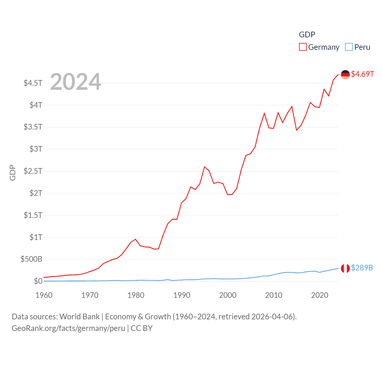 By GDP, Germany ranks 3/197 ($4.69T) and Peru ranks 49/197 ($289B). By GDP per capita, Germany ranks 19/197 ($56,104), while Peru ranks 91/197 ($8,452).