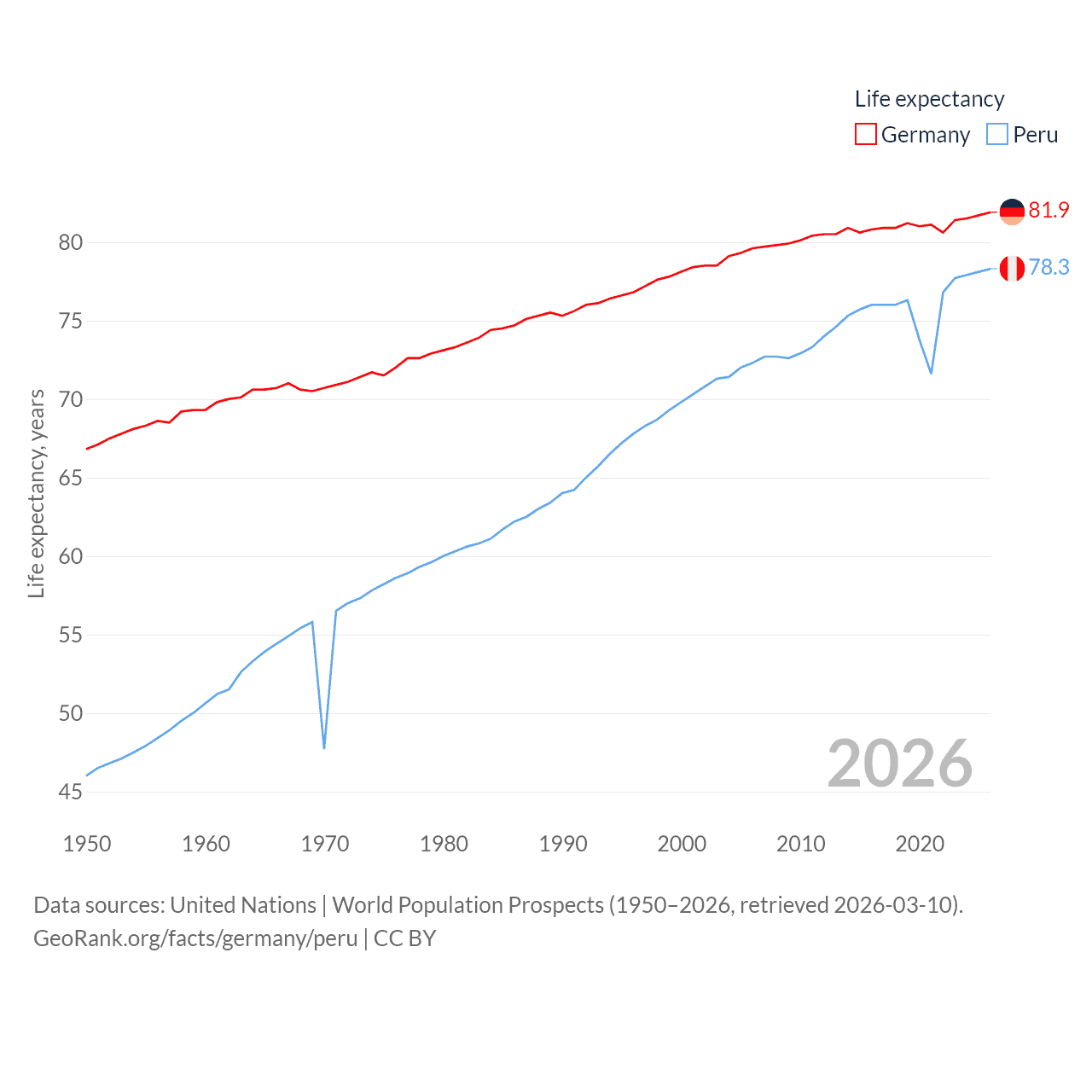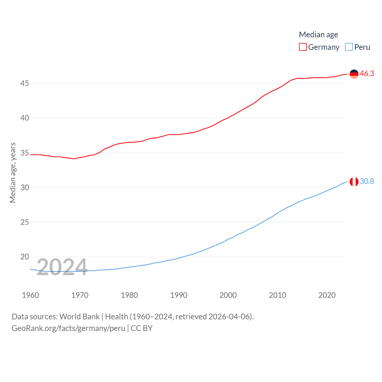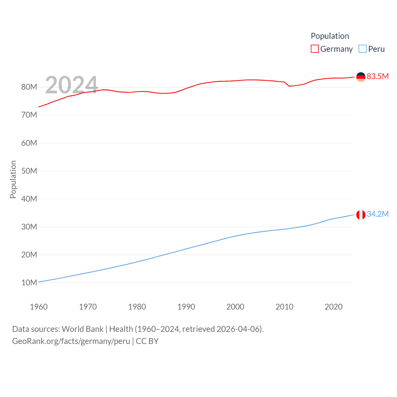 Germany has a population of 83.5M (ranked 19/197), compared with 34.2M in Peru (ranked 48/197). Germany's land area is 134,916 sq mi versus 494,211 sq mi for Peru (ranked 63rd vs. 19th).