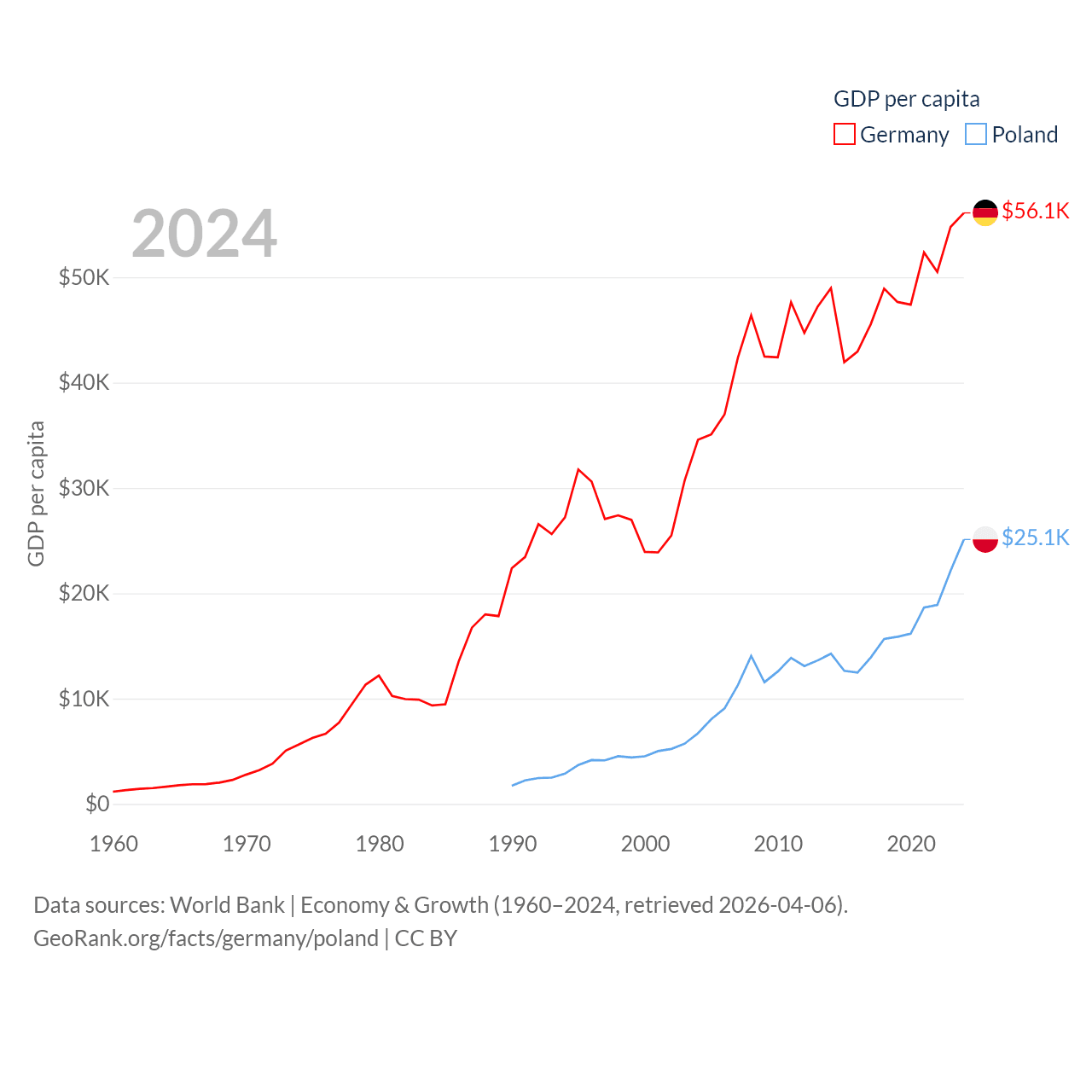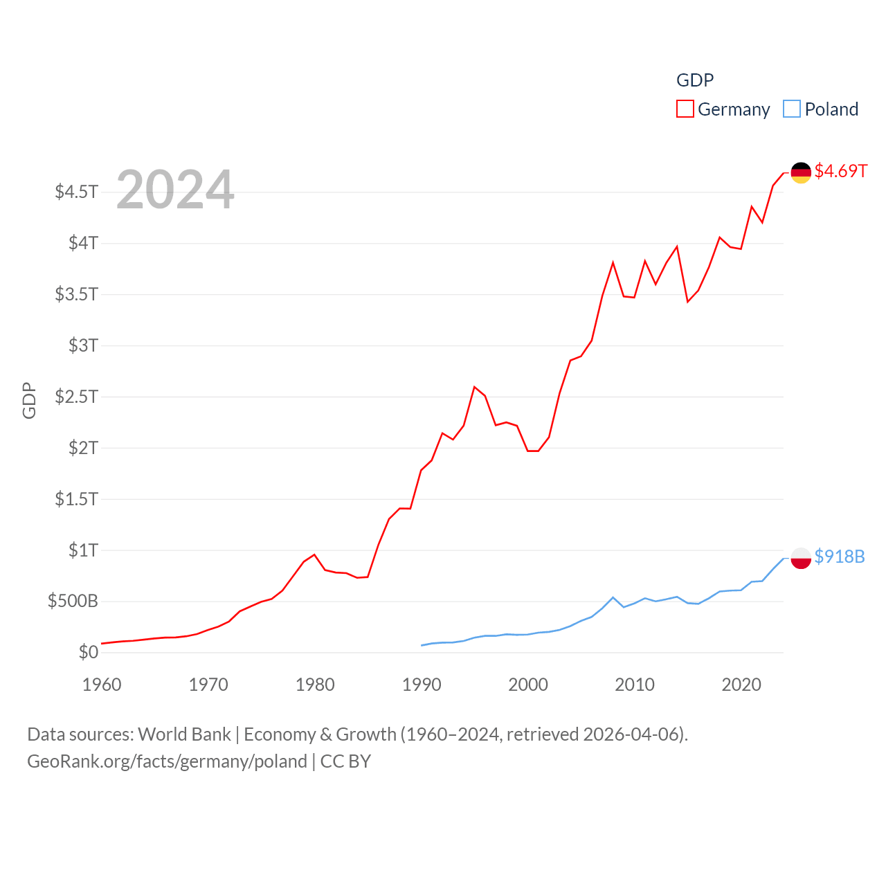 By GDP, Germany ranks 3/197 ($4.69T) and Poland ranks 21/197 ($918B). By GDP per capita, Germany ranks 19/197 ($56,104), while Poland ranks 48/197 ($25,104).