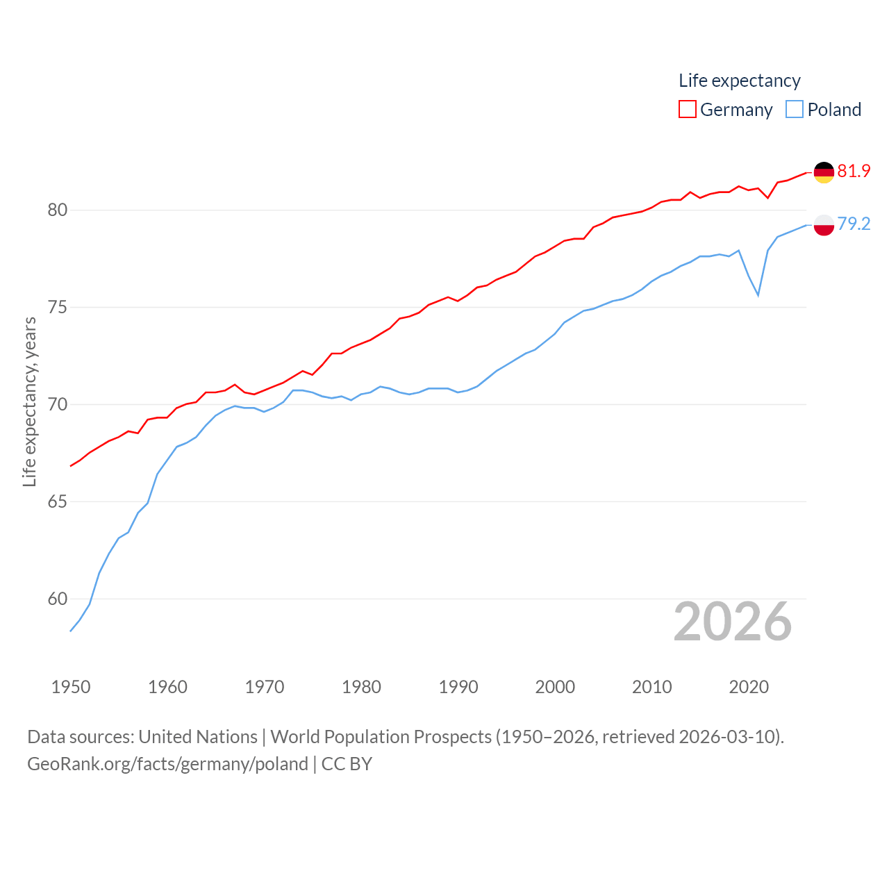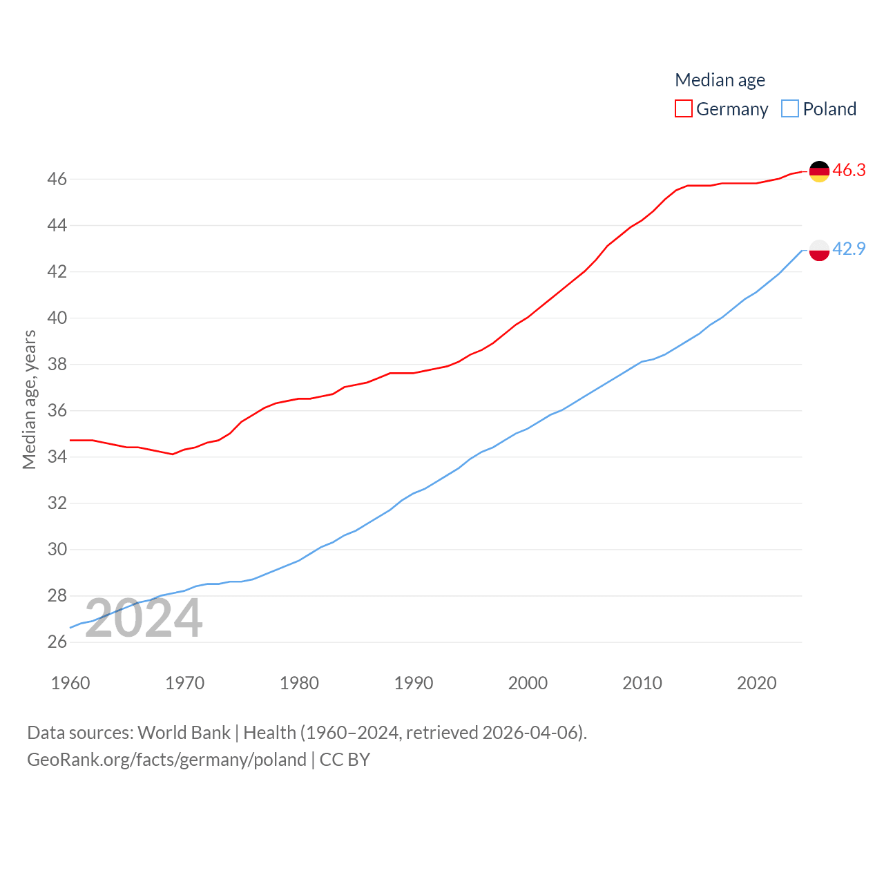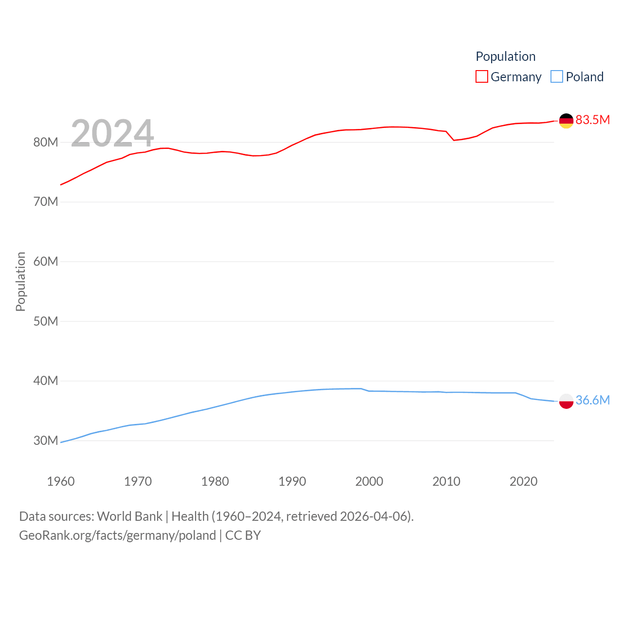 Germany has a population of 83.5M (ranked 19/197), compared with 36.6M in Poland (ranked 42/197). Germany's land area is 134,916 sq mi versus 118,252 sq mi for Poland (ranked 63rd vs. 69th).