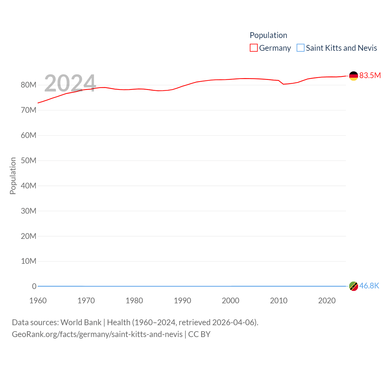 Germany has a population of 83.5M (ranked 19/197), compared with 46.8K in Saint Kitts and Nevis (ranked 189/197). Germany's land area is 134,916 sq mi versus 100.4 sq mi for Saint Kitts and Nevis (ranked 63rd vs. 189th).