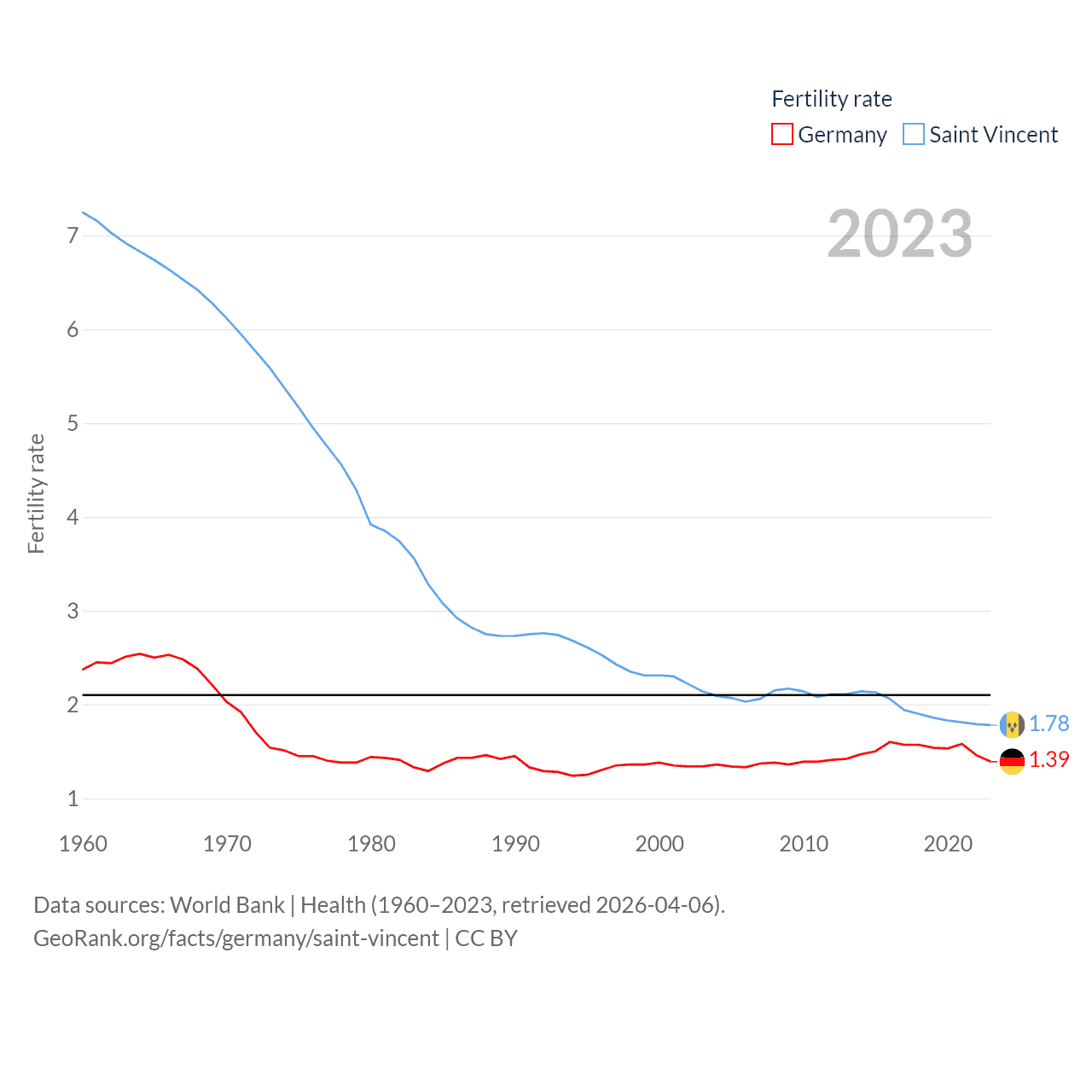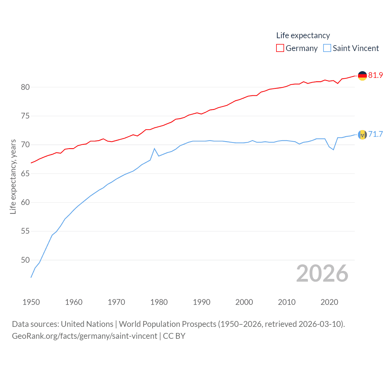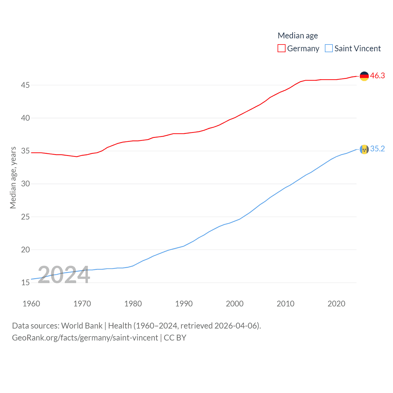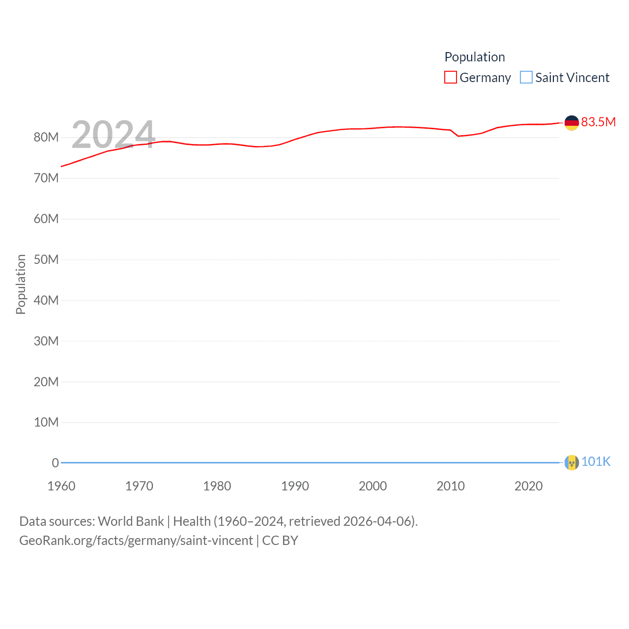 Germany has a population of 83.5M (ranked 19/197), compared with 101K in Saint Vincent (ranked 184/197). Germany's land area is 134,916 sq mi versus 150.6 sq mi for Saint Vincent (ranked 63rd vs. 185th).