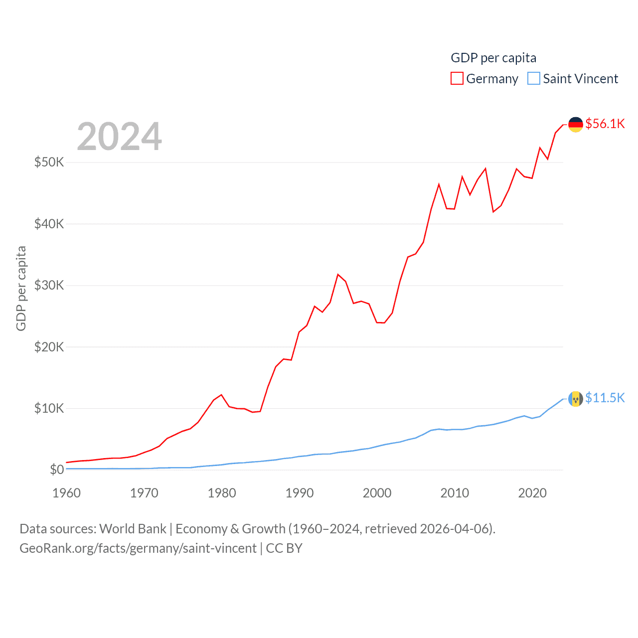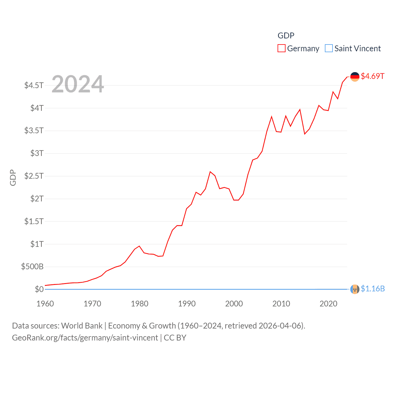 By GDP, Germany ranks 3/197 ($4.69T) and Saint Vincent ranks 186/197 ($1.16B). By GDP per capita, Germany ranks 19/197 ($56,104), while Saint Vincent ranks 81/197 ($11,501).