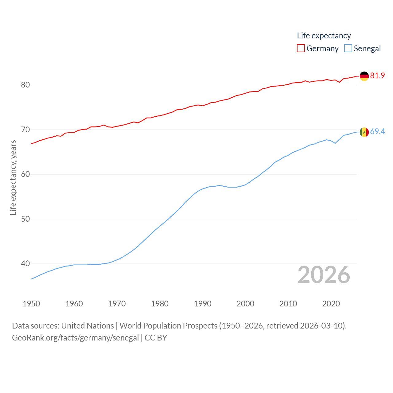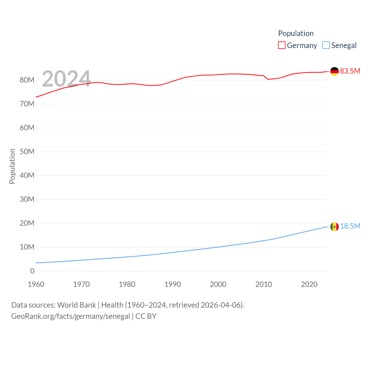 Germany has a population of 83.5M (ranked 19/197), compared with 18.5M in Senegal (ranked 69/197). Germany's land area is 134,916 sq mi versus 74,336 sq mi for Senegal (ranked 63rd vs. 85th).