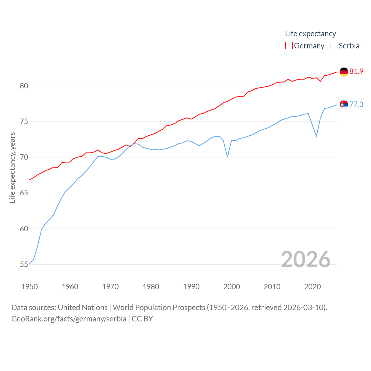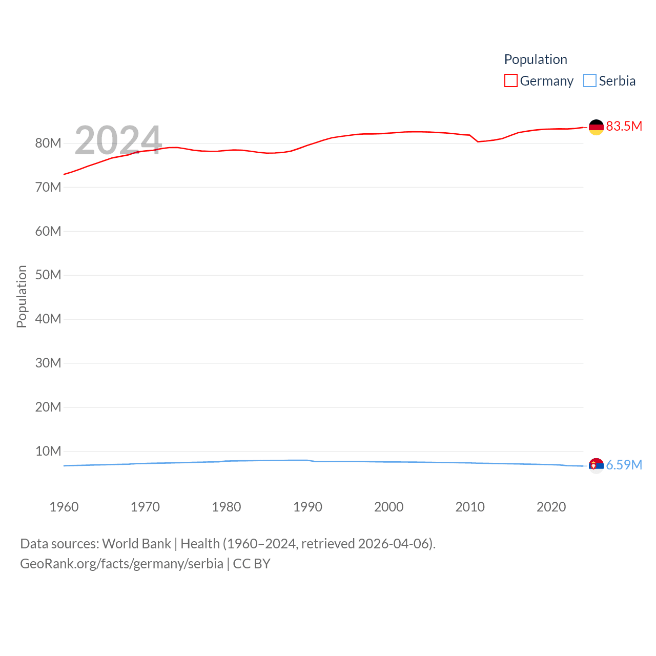 Germany has a population of 83.5M (ranked 19/197), compared with 6.59M in Serbia (ranked 109/197). Germany's land area is 134,916 sq mi versus 32,467 sq mi for Serbia (ranked 63rd vs. 111th).