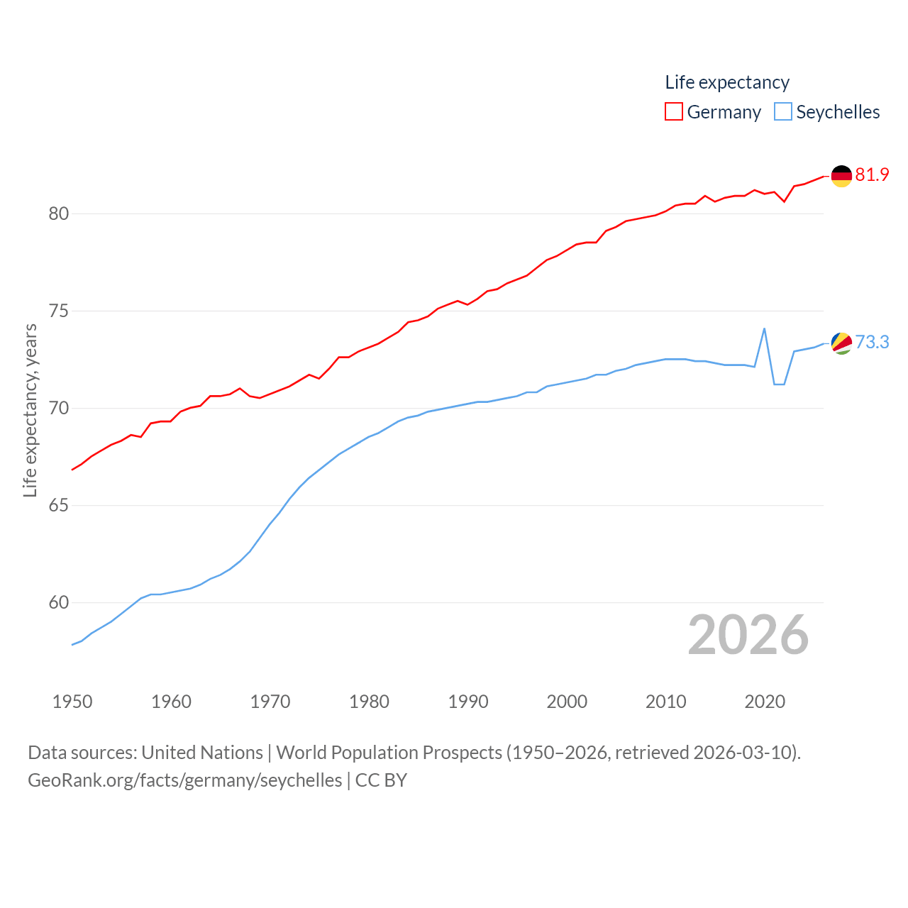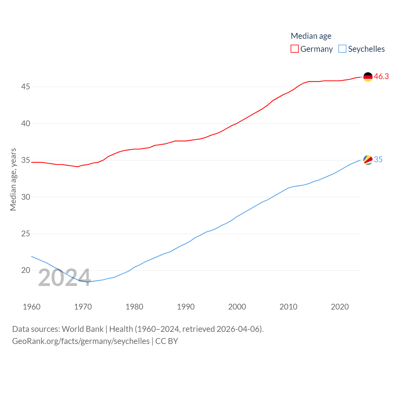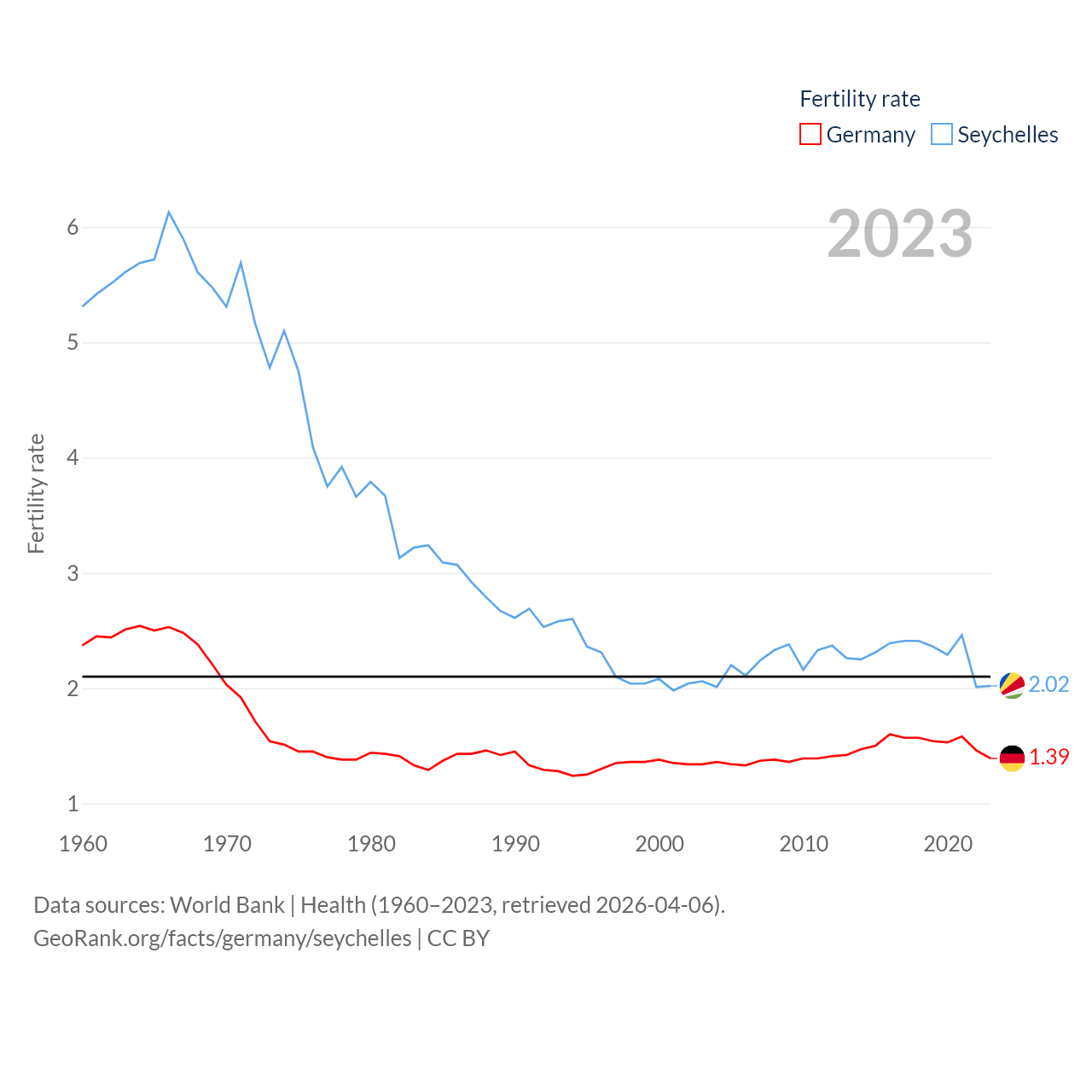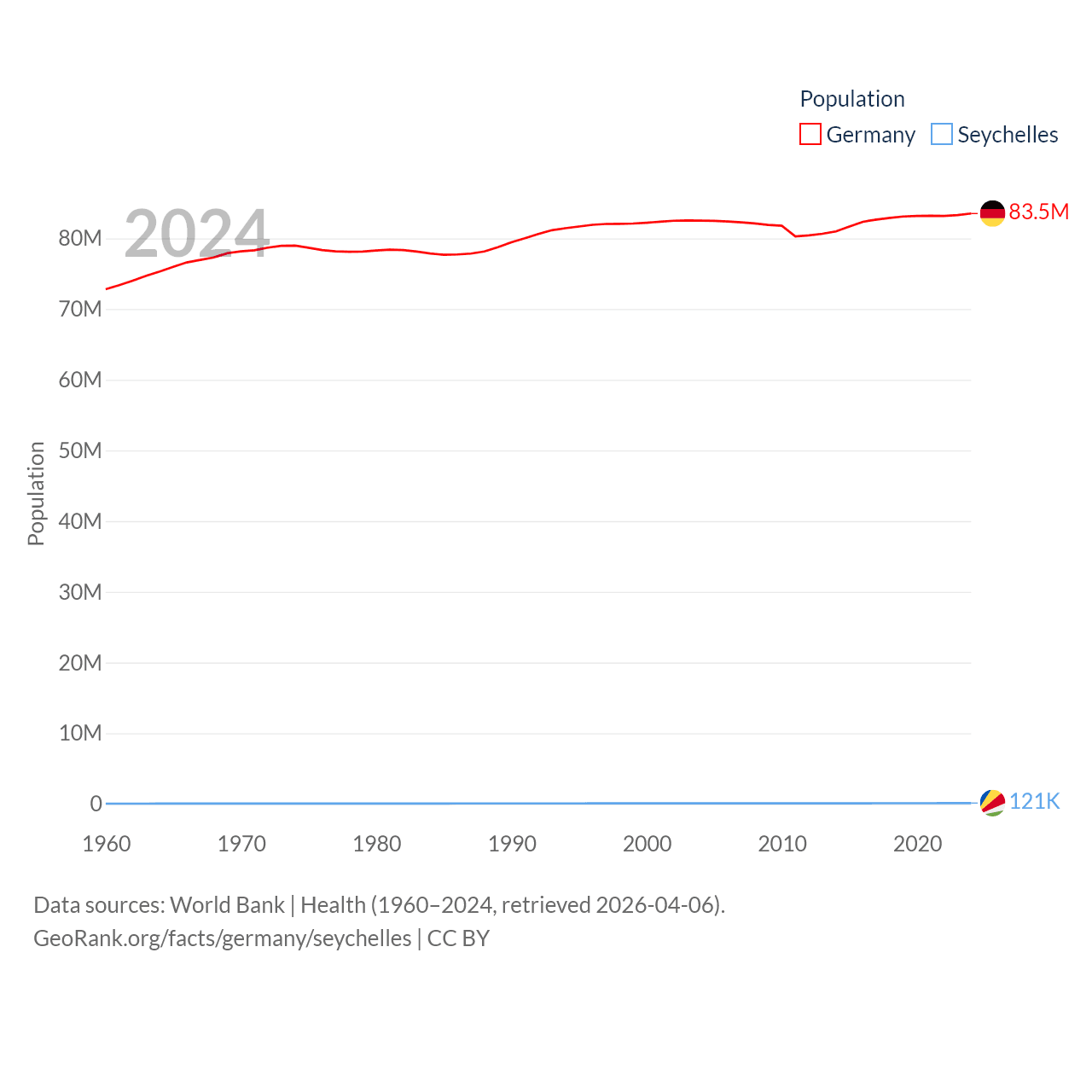Germany has a population of 83.5M (ranked 19/197), compared with 121K in The Seychelles (ranked 181/197). Germany's land area is 134,916 sq mi versus 177.6 sq mi for The Seychelles (ranked 63rd vs. 181st).