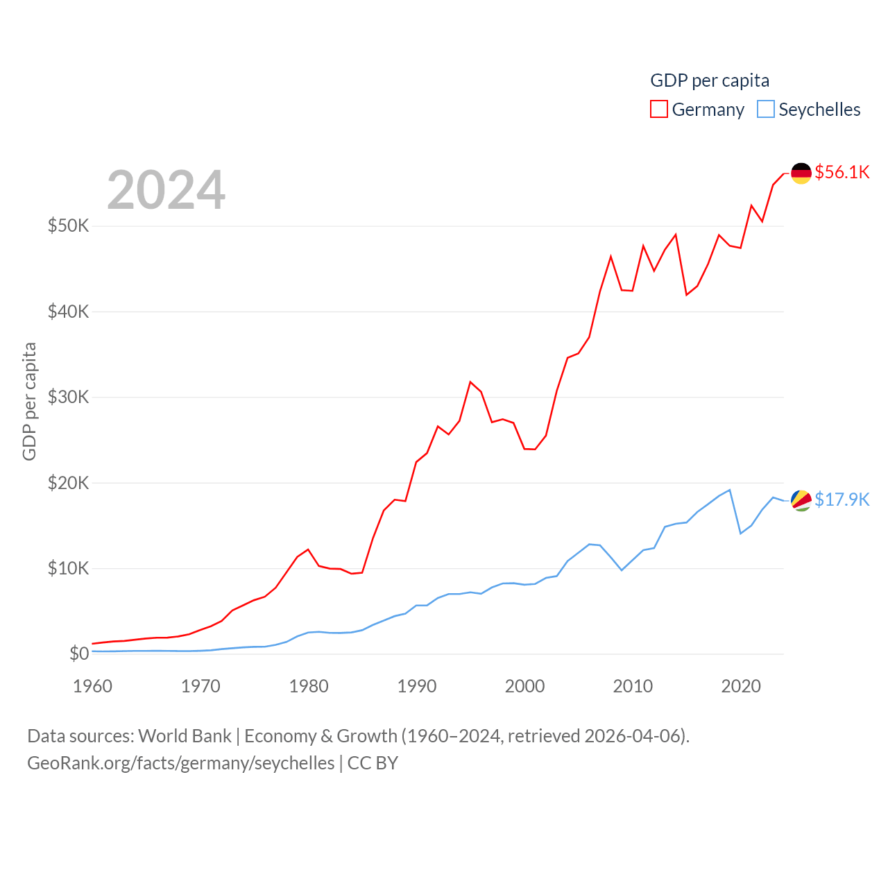 By GDP, Germany ranks 3/197 ($4.69T) and The Seychelles ranks 178/197 ($2.17B). By GDP per capita, Germany ranks 19/197 ($56,104), while The Seychelles ranks 63/197 ($17,859).