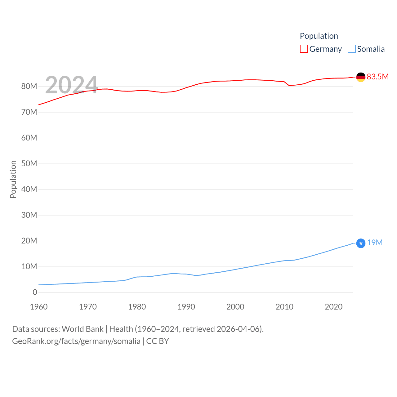 Germany has a population of 83.5M (ranked 19/197), compared with 19M in Somalia (ranked 68/197). Germany's land area is 134,916 sq mi versus 242,217 sq mi for Somalia (ranked 63rd vs. 42nd).