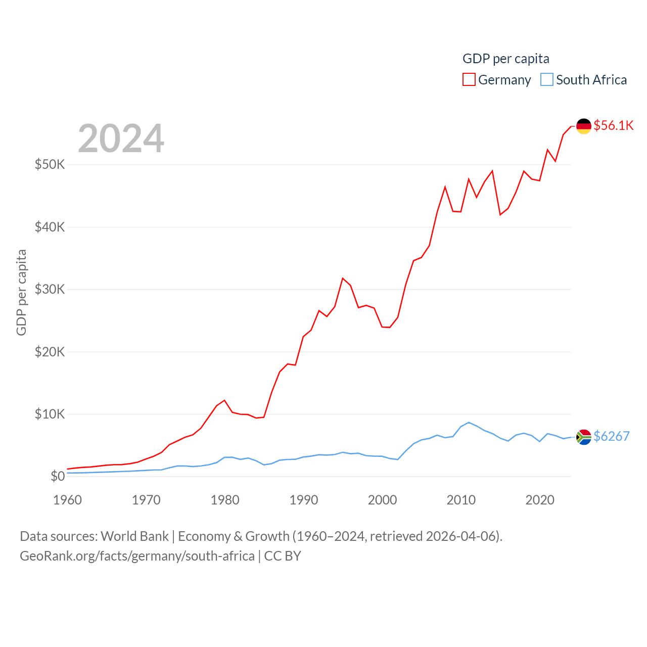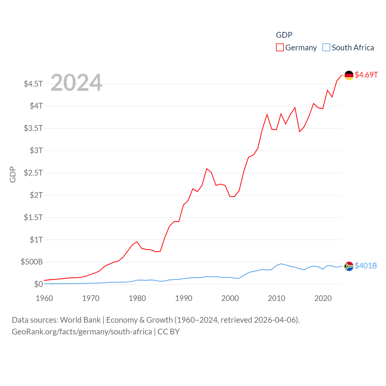 By GDP, Germany ranks 3/197 ($4.69T) and South Africa ranks 40/197 ($401B). By GDP per capita, Germany ranks 19/197 ($56,104), while South Africa ranks 111/197 ($6,267).