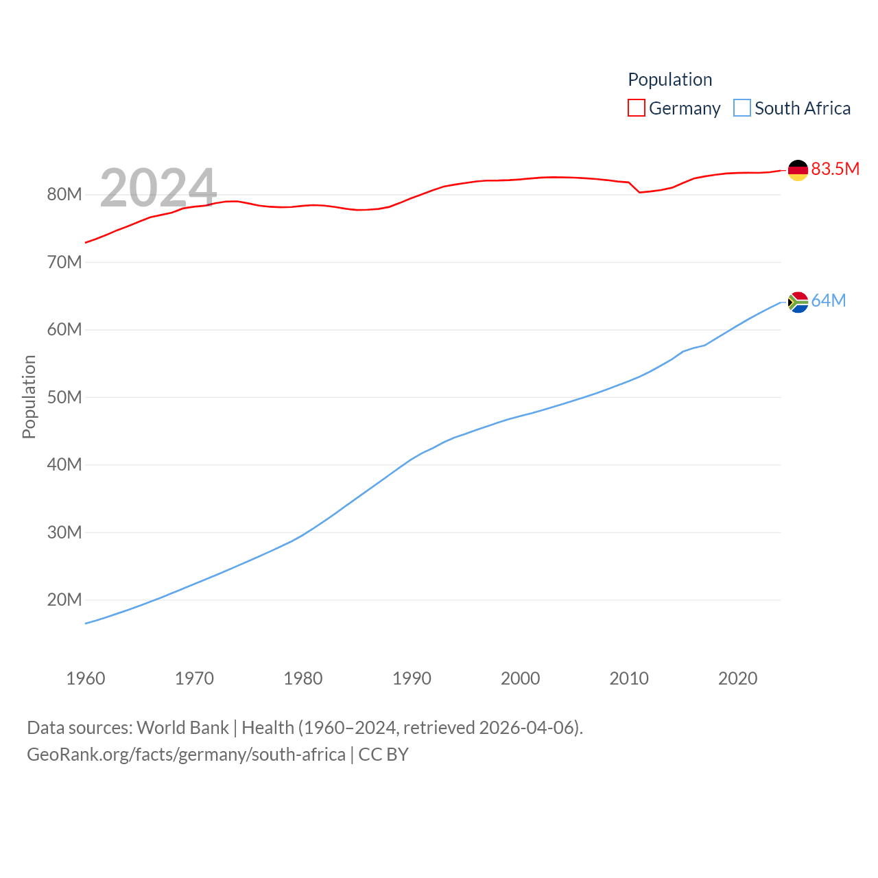 Germany has a population of 83.5M (ranked 19/197), compared with 64M in South Africa (ranked 24/197). Germany's land area is 134,916 sq mi versus 468,377 sq mi for South Africa (ranked 63rd vs. 24th).