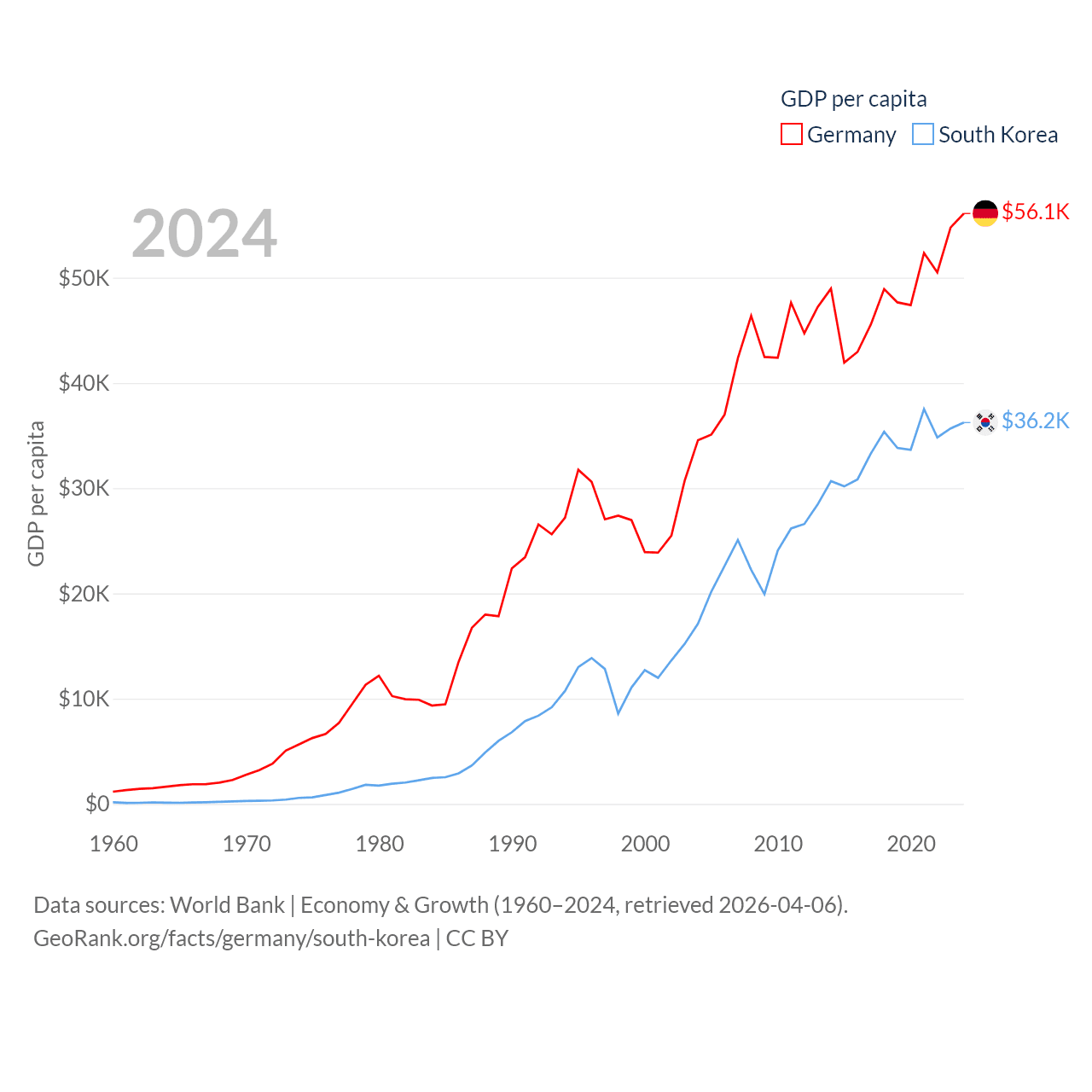 By GDP, Germany ranks 3/197 ($4.69T) and South Korea ranks 12/197 ($1.88T). By GDP per capita, Germany ranks 19/197 ($56,104), while South Korea ranks 31/197 ($36,239).