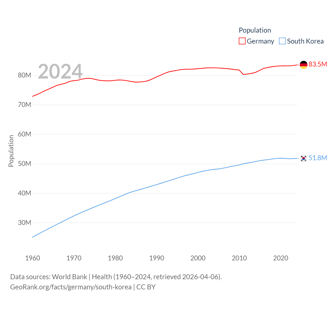 Germany has a population of 83.5M (ranked 19/197), compared with 51.8M in South Korea (ranked 29/197). Germany's land area is 134,916 sq mi versus 37,684 sq mi for South Korea (ranked 63rd vs. 105th).