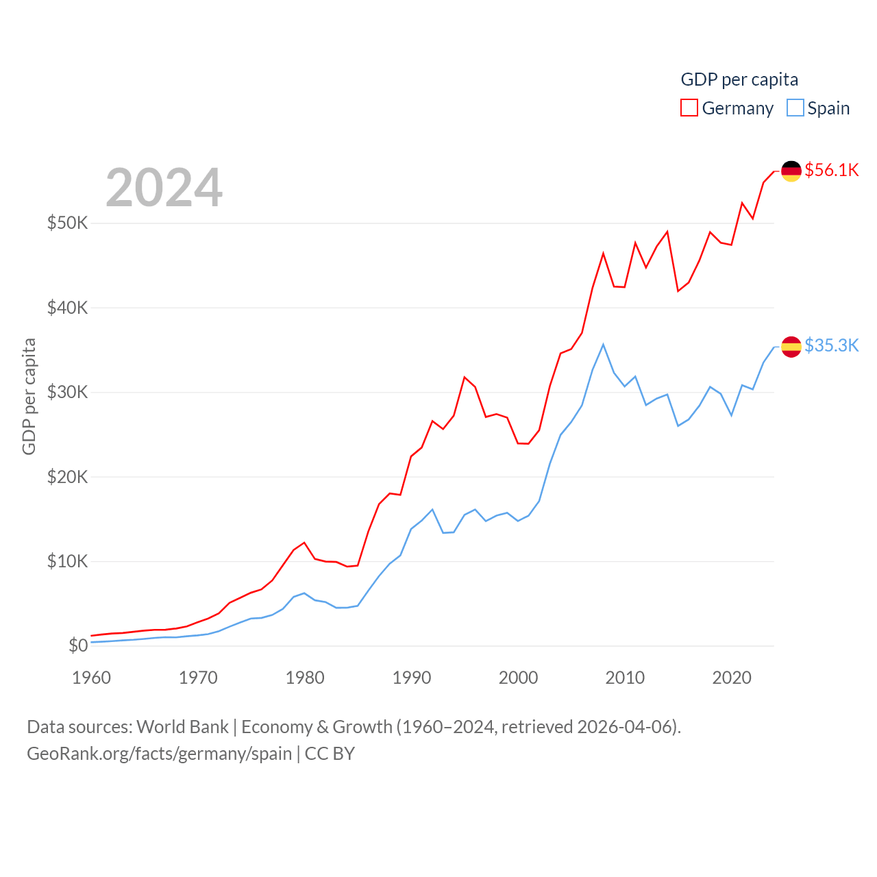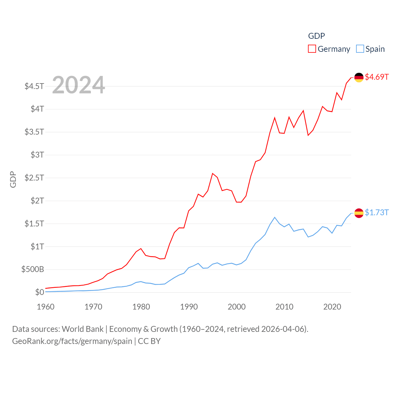 By GDP, Germany ranks 3/197 ($4.69T) and Spain ranks 15/197 ($1.73T). By GDP per capita, Germany ranks 19/197 ($56,104), while Spain ranks 32/197 ($35,327).