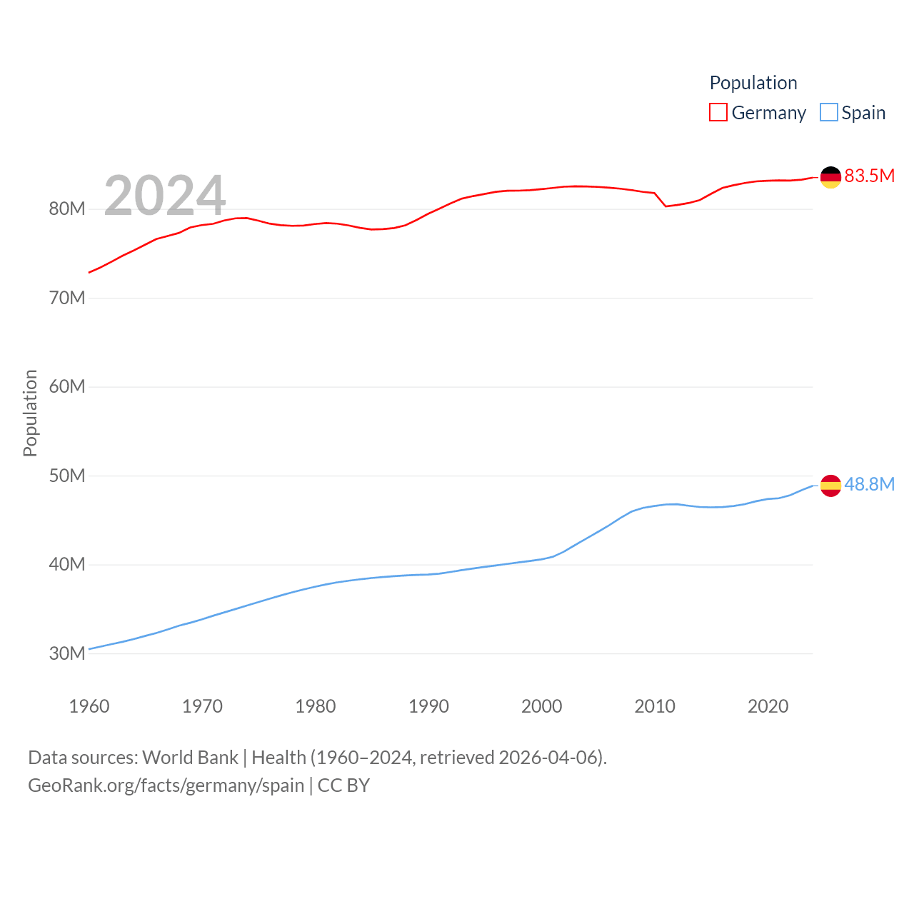 Germany has a population of 83.5M (ranked 19/197), compared with 48.8M in Spain (ranked 32/197). Germany's land area is 134,916 sq mi versus 192,934 sq mi for Spain (ranked 63rd vs. 51st).
