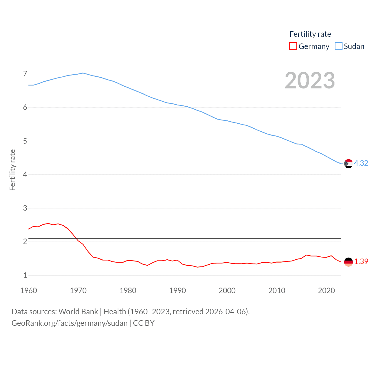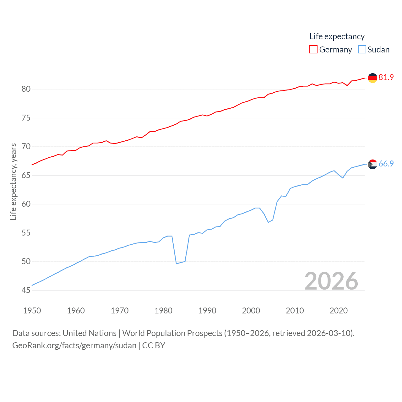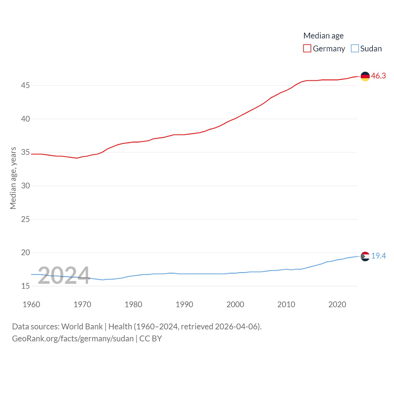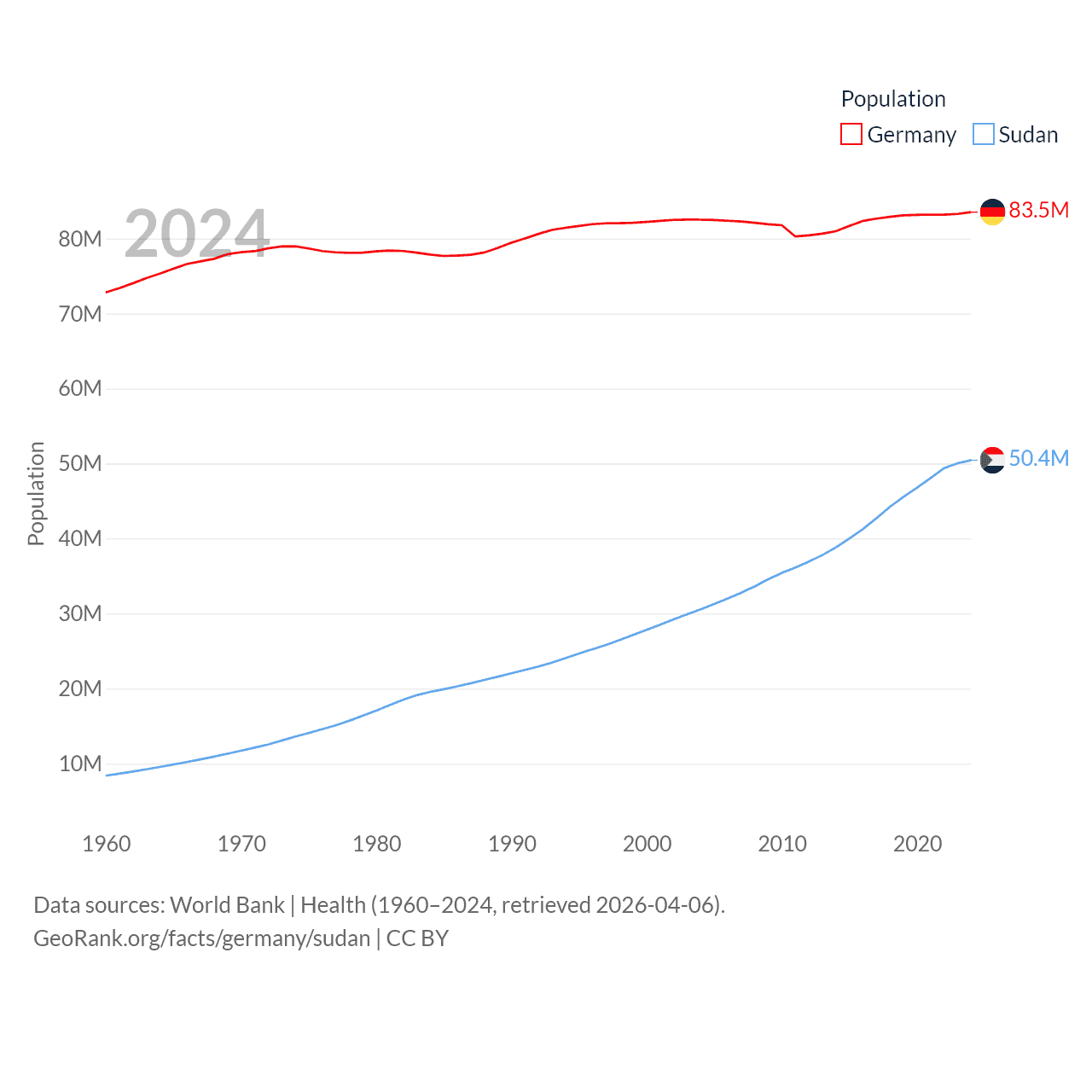 Germany has a population of 83.5M (ranked 19/197), compared with 50.4M in Sudan (ranked 30/197). Germany's land area is 134,916 sq mi versus 721,239 sq mi for Sudan (ranked 63rd vs. 15th).