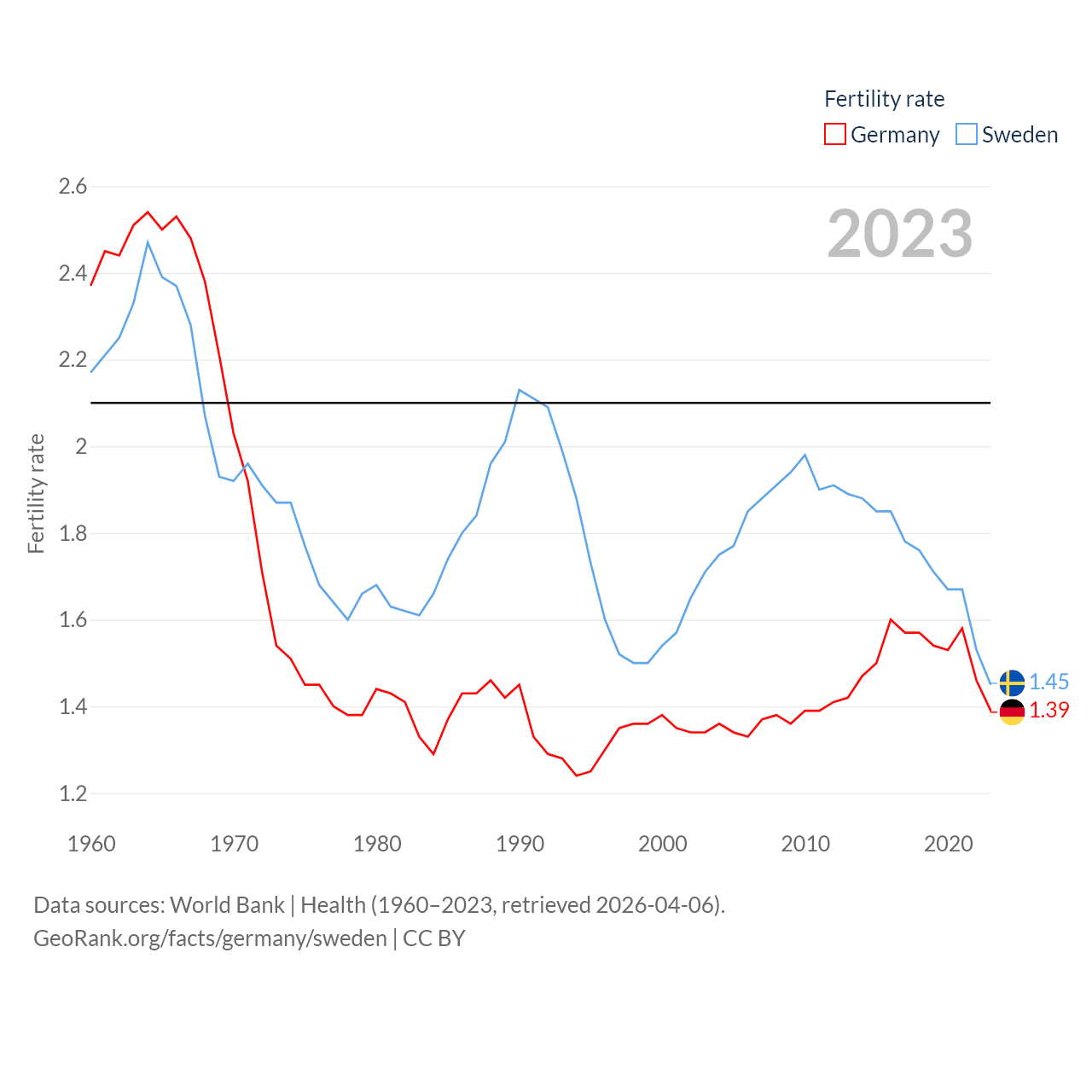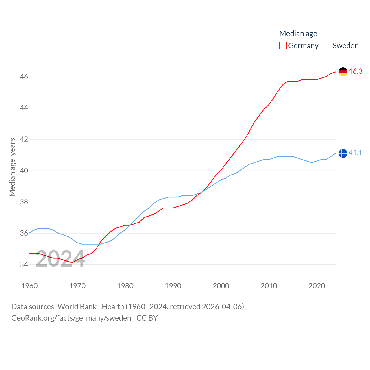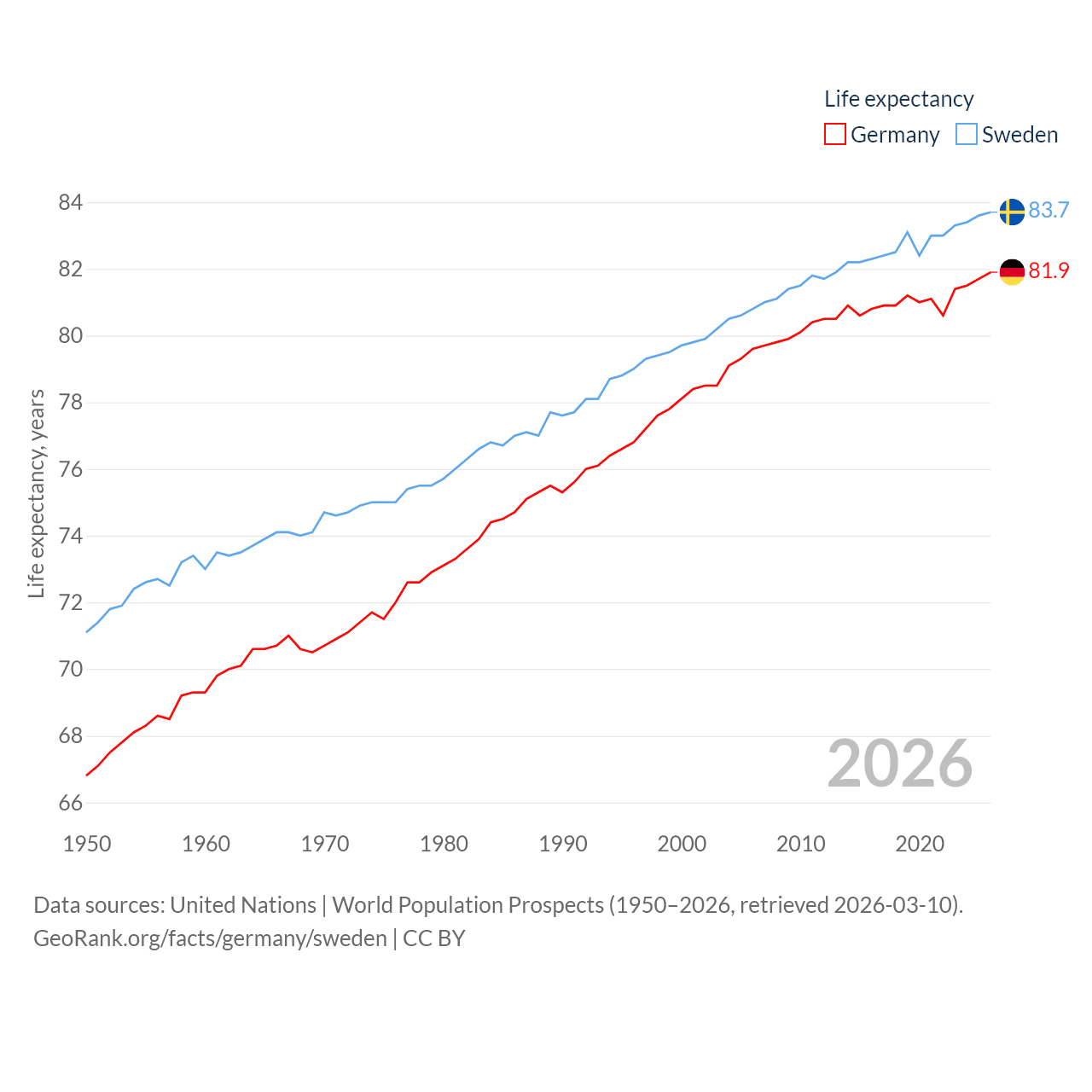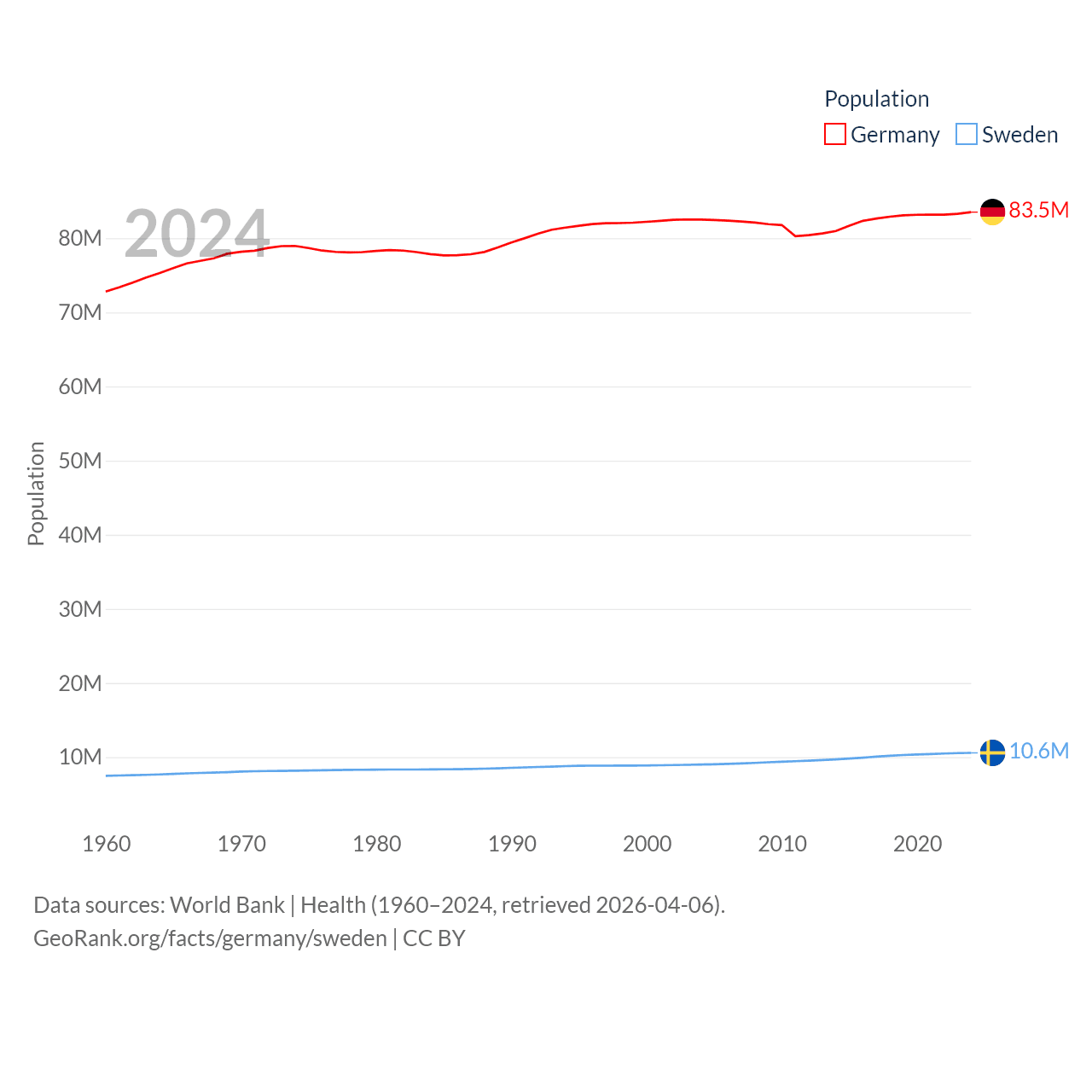Germany has a population of 83.5M (ranked 19/197), compared with 10.6M in Sweden (ranked 93/197). Germany's land area is 134,916 sq mi versus 157,248 sq mi for Sweden (ranked 63rd vs. 58th).