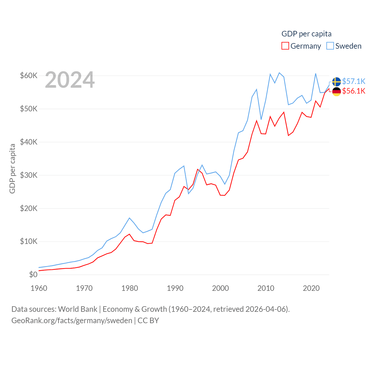 By GDP, Germany ranks 3/197 ($4.69T) and Sweden ranks 26/197 ($604B). By GDP per capita, Germany ranks 19/197 ($56,104), while Sweden ranks 17/197 ($57,117).