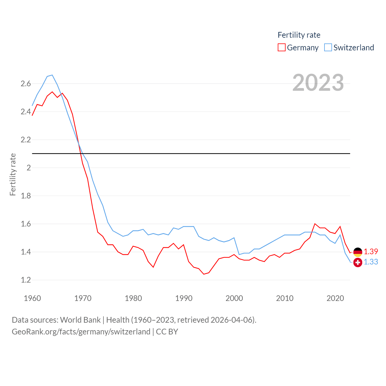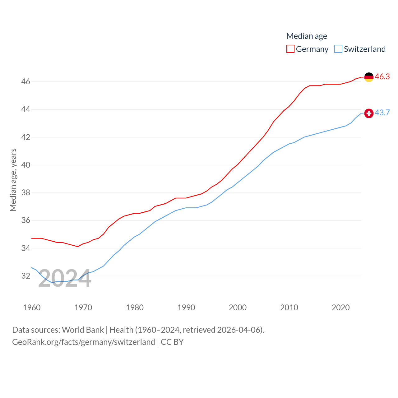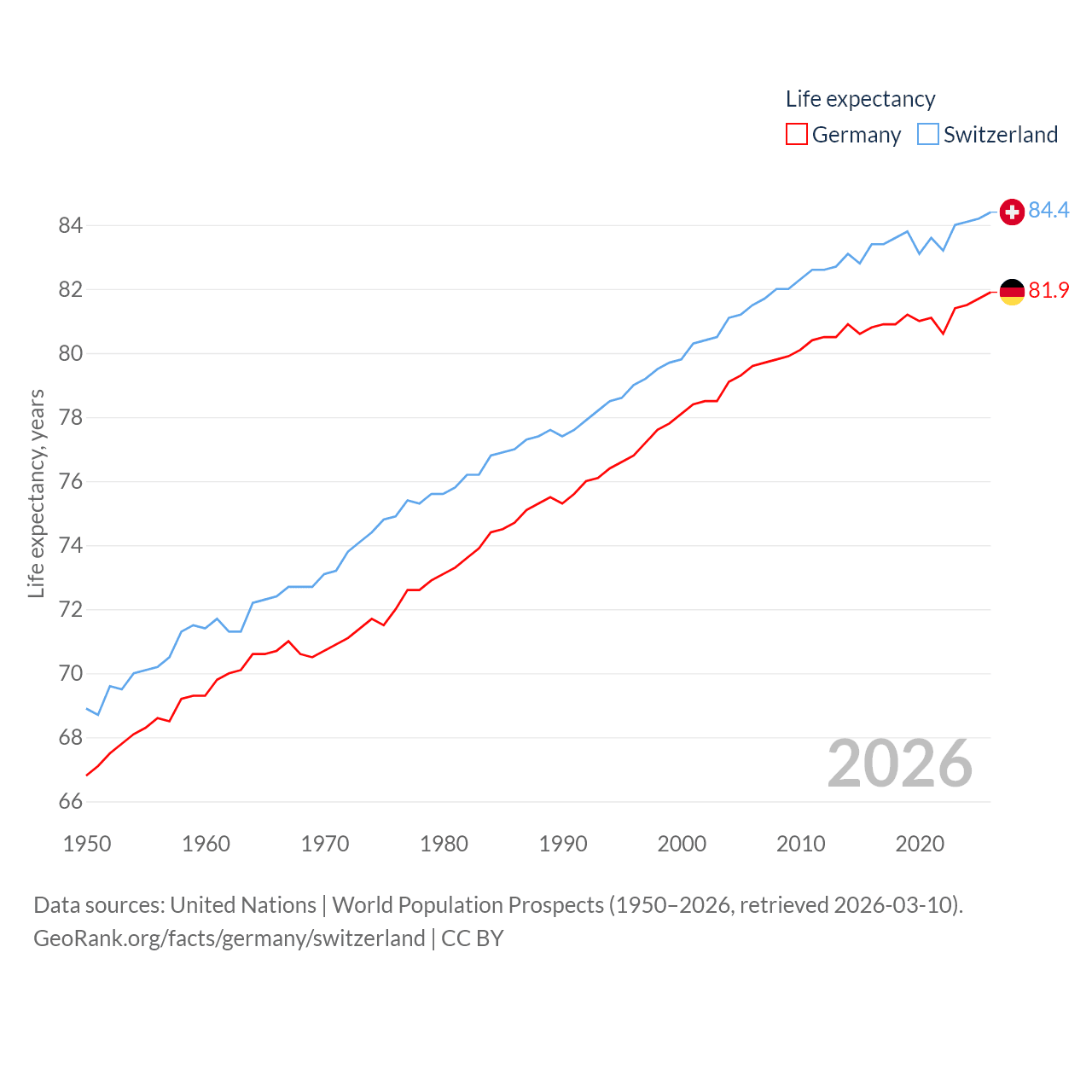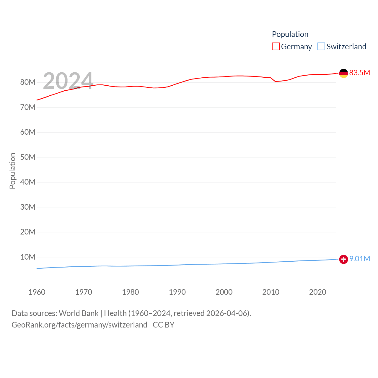 Germany has a population of 83.5M (ranked 19/197), compared with 9.01M in Switzerland (ranked 101/197). Germany's land area is 134,916 sq mi versus 15,255 sq mi for Switzerland (ranked 63rd vs. 131st).