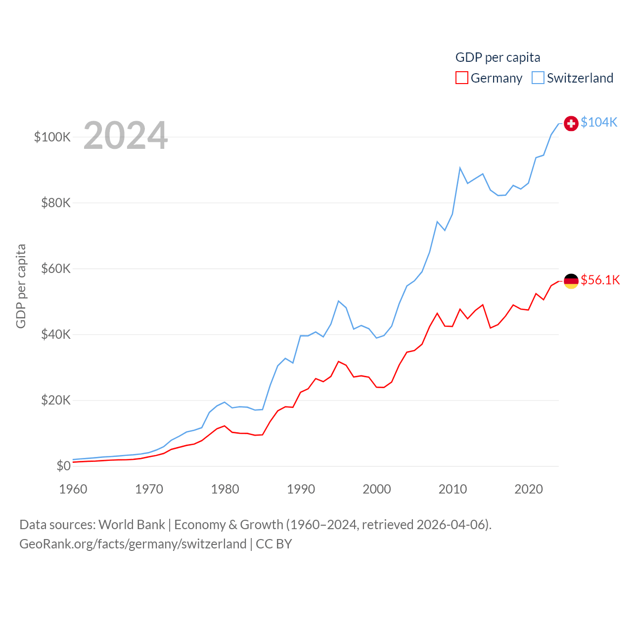 By GDP, Germany ranks 3/197 ($4.69T) and Switzerland ranks 20/197 ($937B). By GDP per capita, Germany ranks 19/197 ($56,104), while Switzerland ranks 5/197 ($103,998).