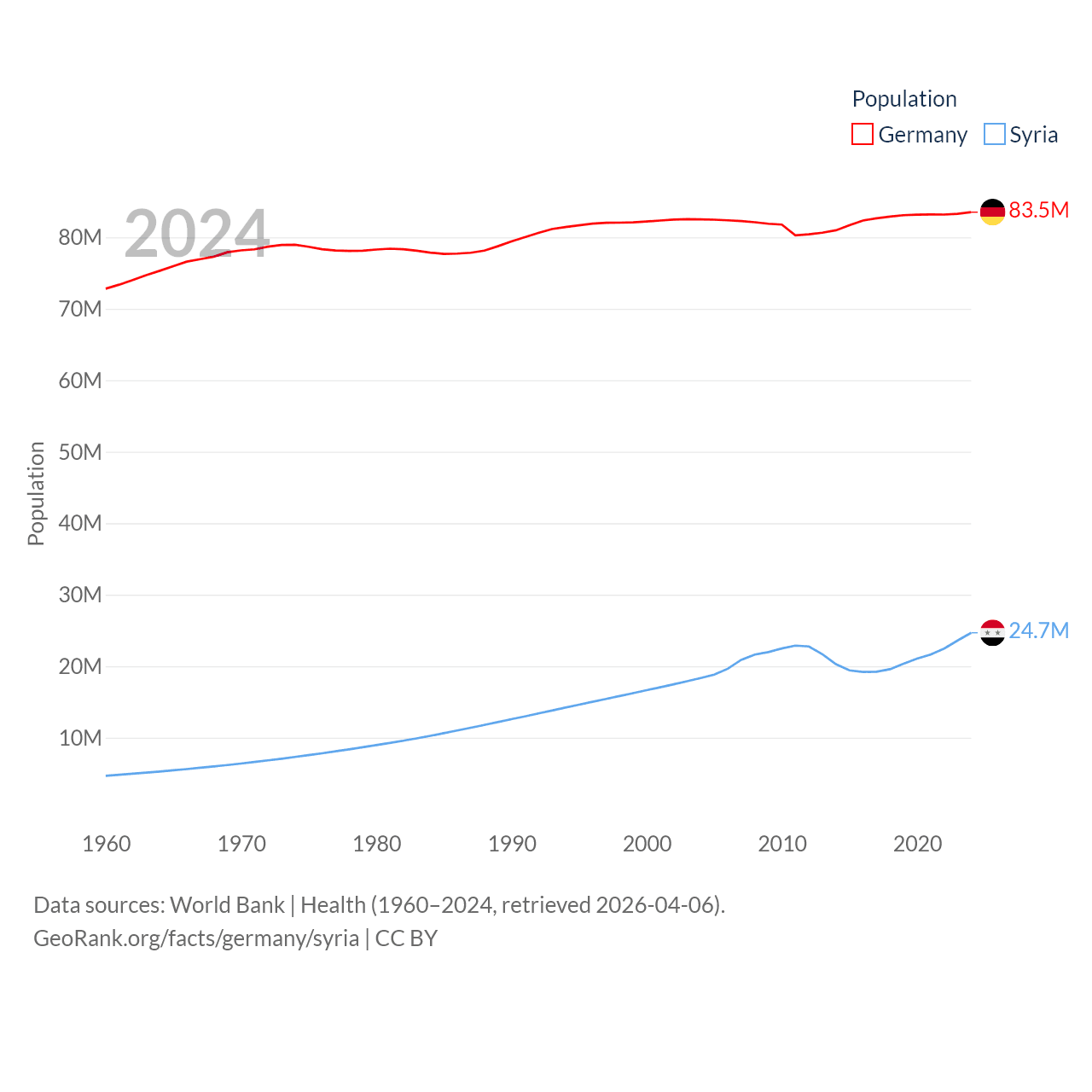 Germany has a population of 83.5M (ranked 19/197), compared with 24.7M in Syria (ranked 57/197). Germany's land area is 134,916 sq mi versus 70,900 sq mi for Syria (ranked 63rd vs. 87th).