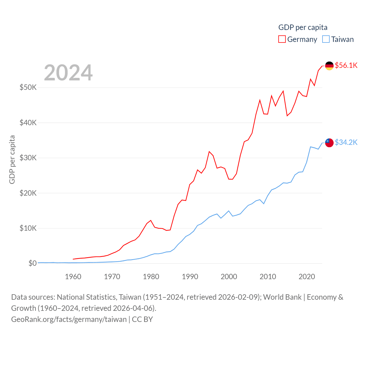 By GDP, Germany ranks 3/197 ($4.69T) and Taiwan ranks 22/197 ($802B). By GDP per capita, Germany ranks 19/197 ($56,104), while Taiwan ranks 35/197 ($34,238).