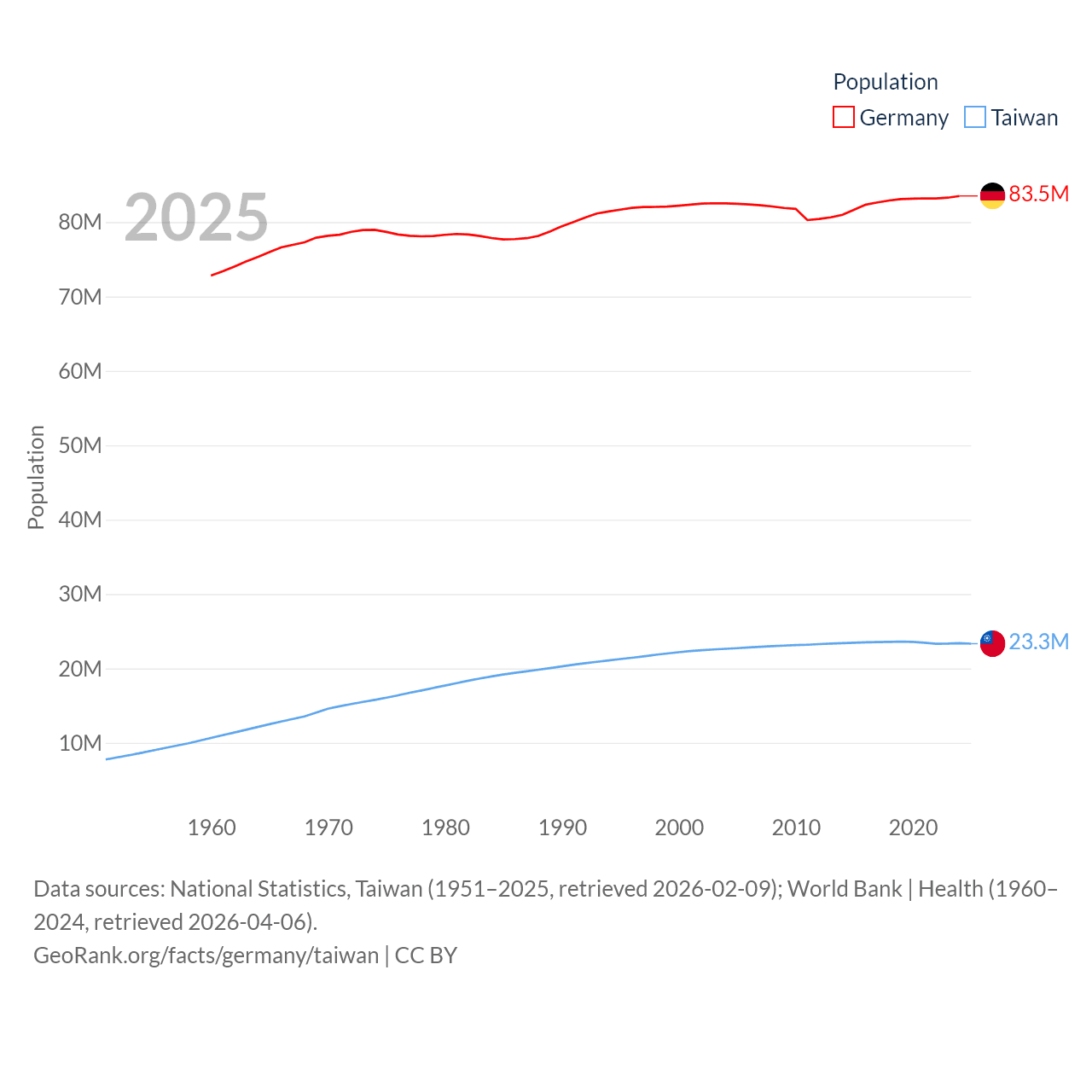 Germany has a population of 83.5M (ranked 19/197), compared with 23.3M in Taiwan (ranked 60/197). Germany's land area is 134,916 sq mi versus 13,976 sq mi for Taiwan (ranked 63rd vs. 133rd).
