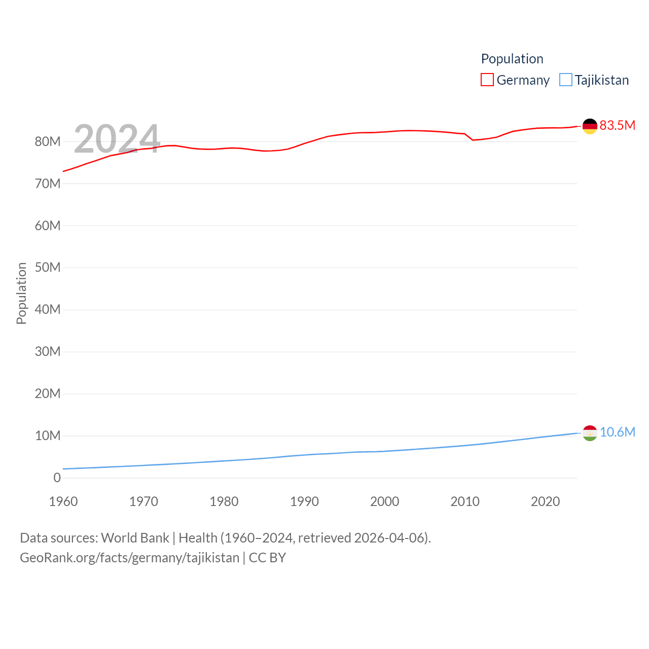 Germany has a population of 83.5M (ranked 19/197), compared with 10.6M in Tajikistan (ranked 91/197). Germany's land area is 134,916 sq mi versus 53,587 sq mi for Tajikistan (ranked 63rd vs. 93rd).