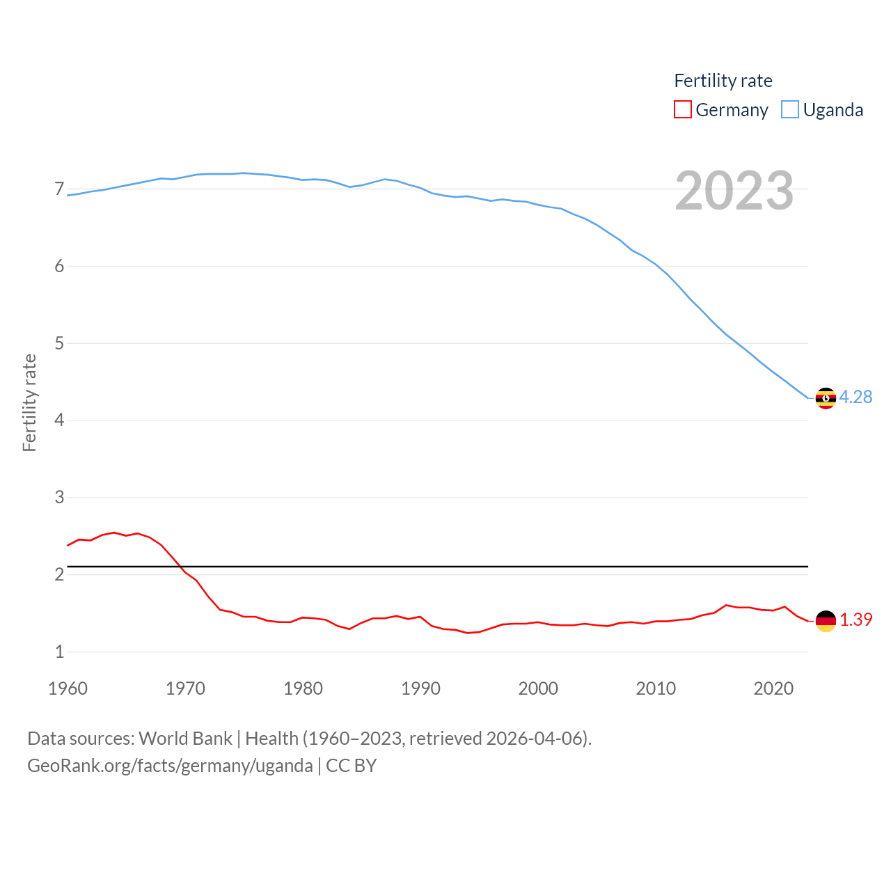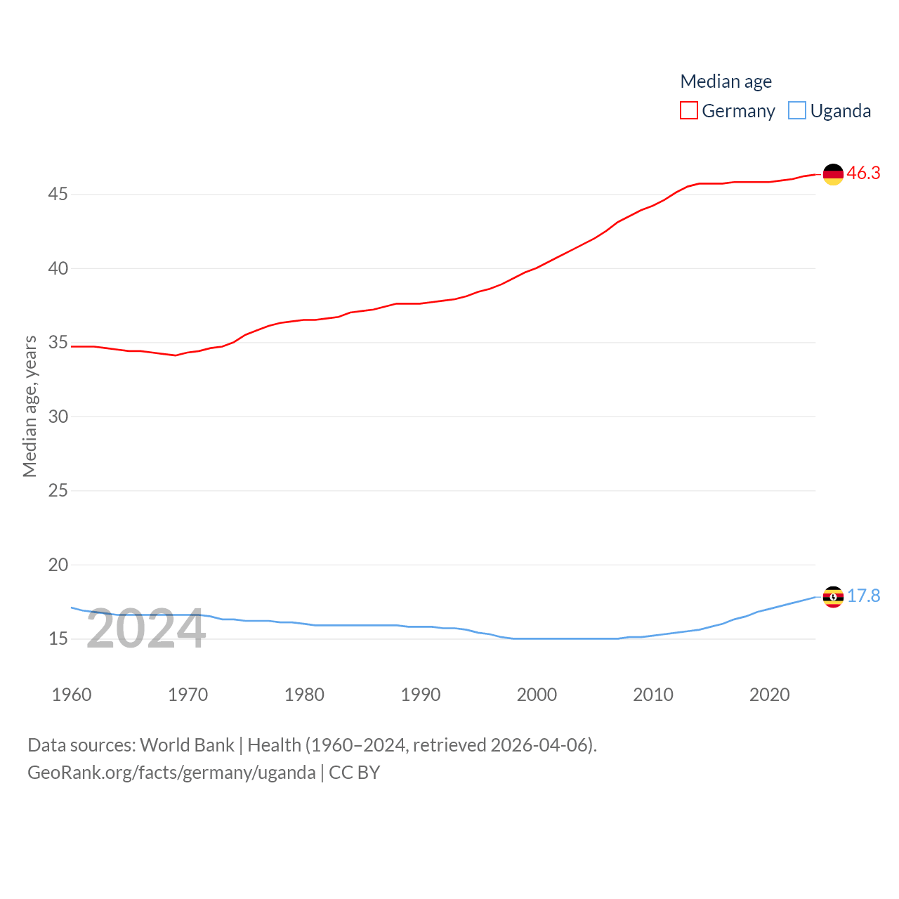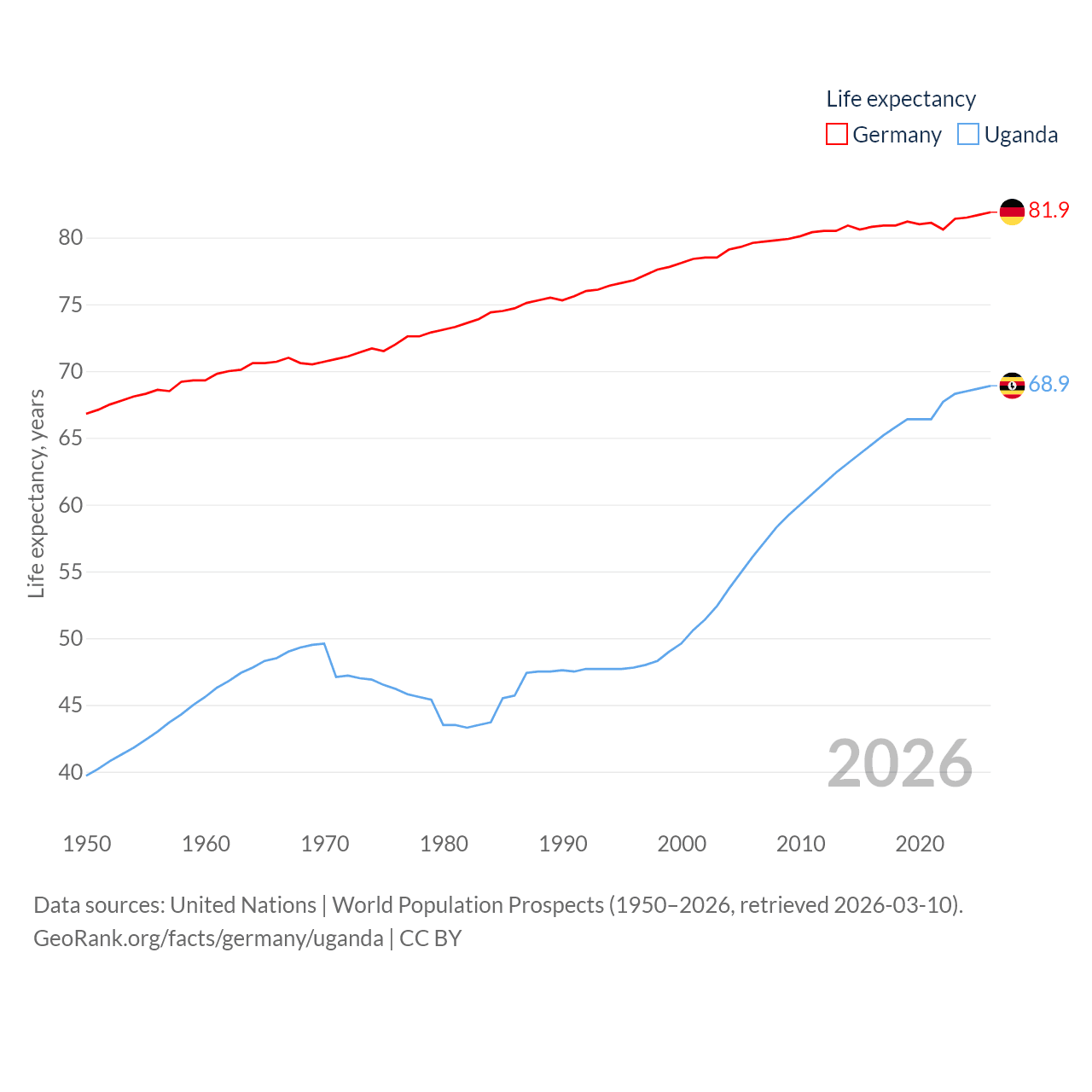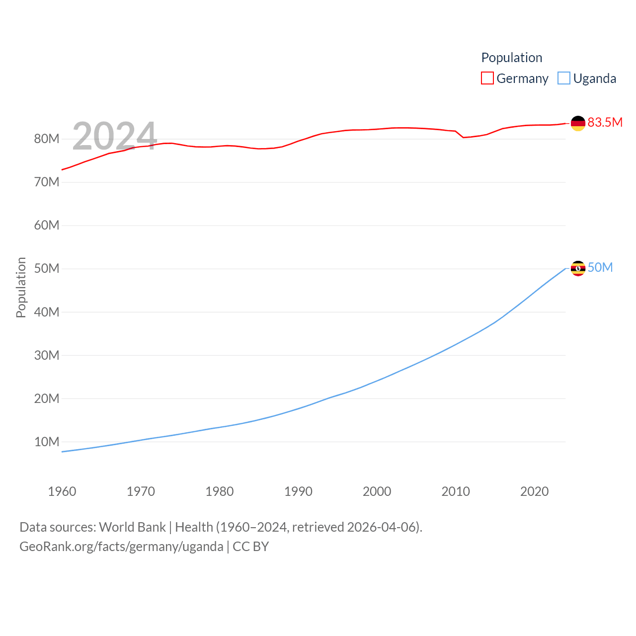 Germany has a population of 83.5M (ranked 19/197), compared with 50M in Uganda (ranked 31/197). Germany's land area is 134,916 sq mi versus 77,421 sq mi for Uganda (ranked 63rd vs. 84th).