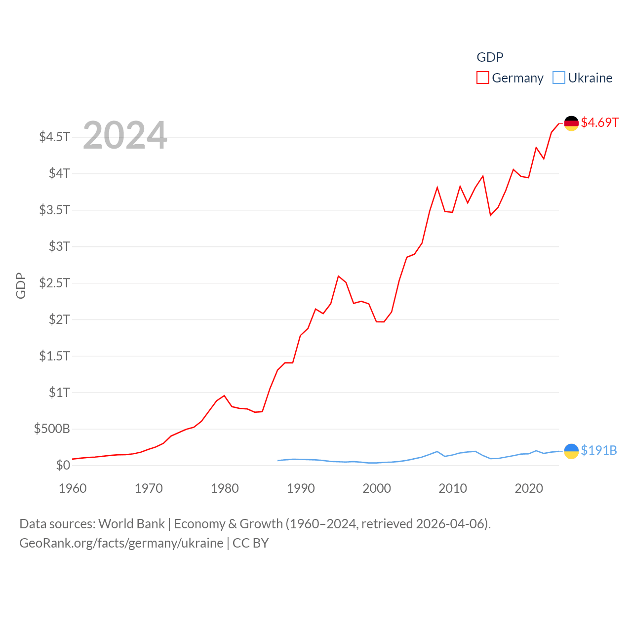 By GDP, Germany ranks 3/197 ($4.69T) and Ukraine ranks 57/197 ($191B). By GDP per capita, Germany ranks 19/197 ($56,104), while Ukraine ranks 120/197 ($5,038).