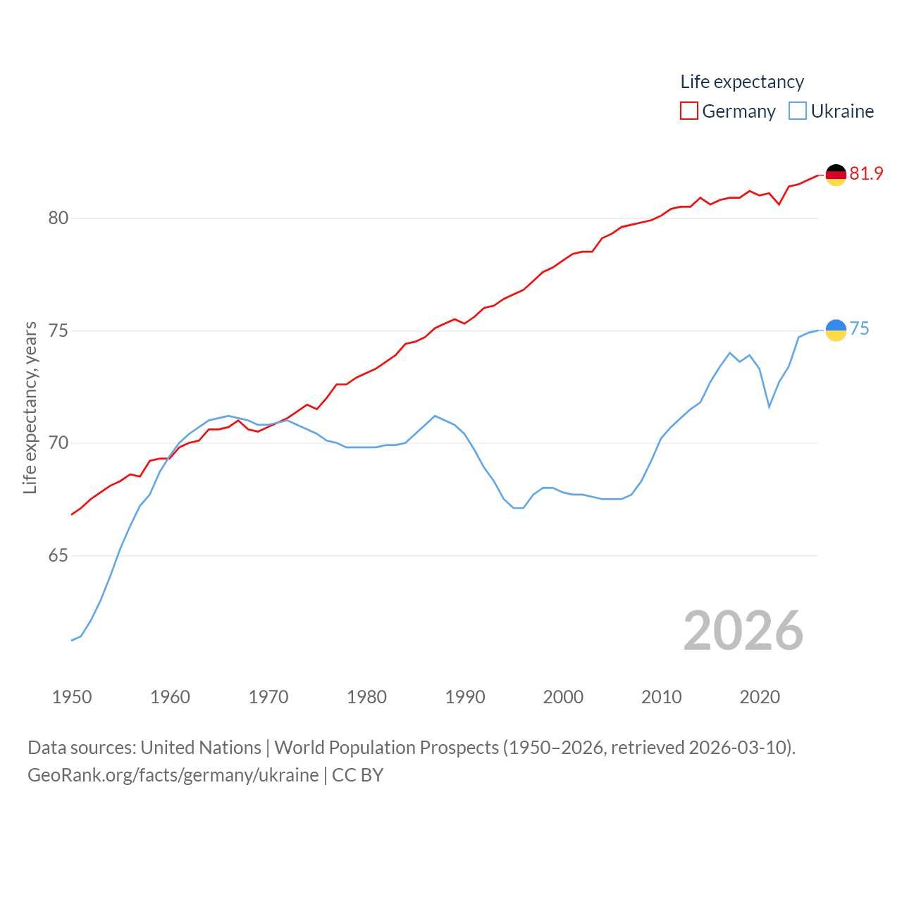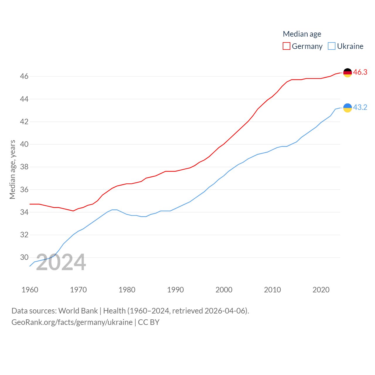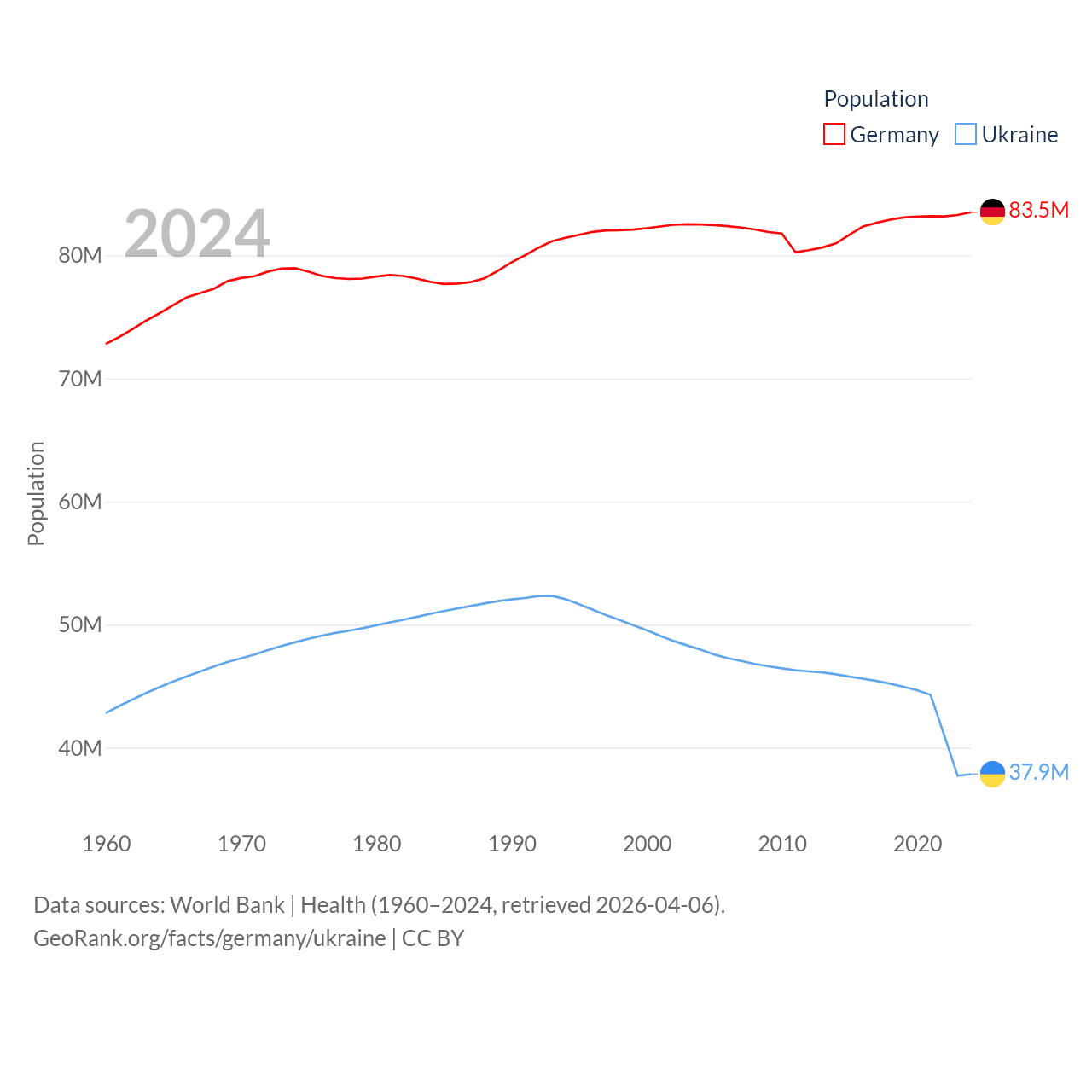 Germany has a population of 83.5M (ranked 19/197), compared with 37.9M in Ukraine (ranked 41/197). Germany's land area is 134,916 sq mi versus 223,708 sq mi for Ukraine (ranked 63rd vs. 46th).