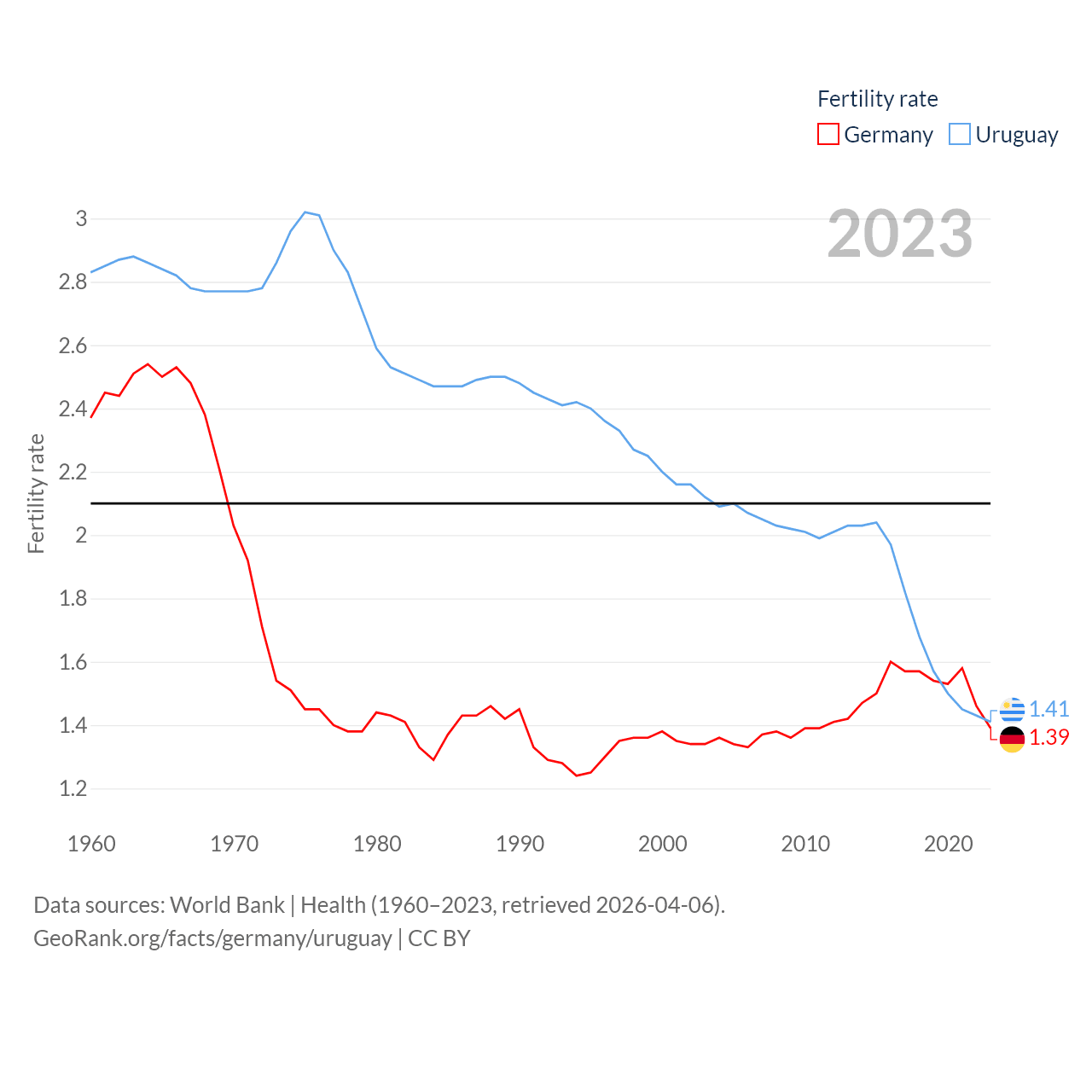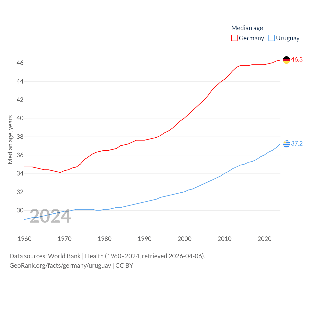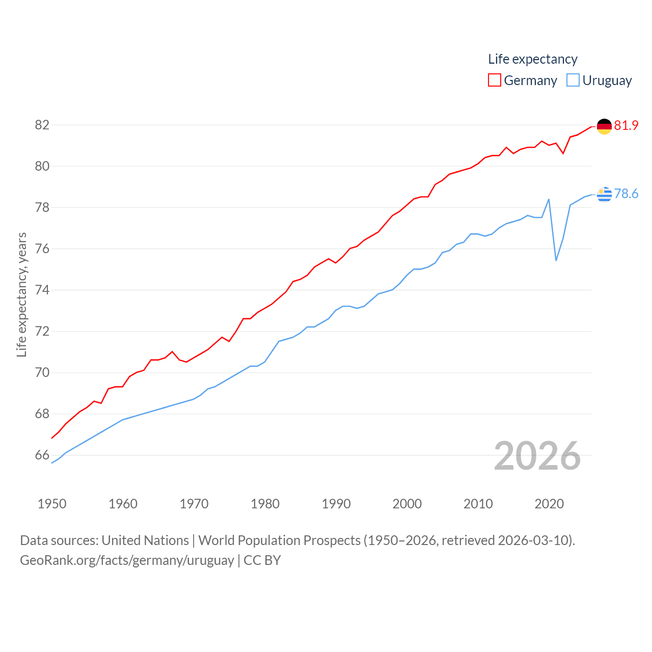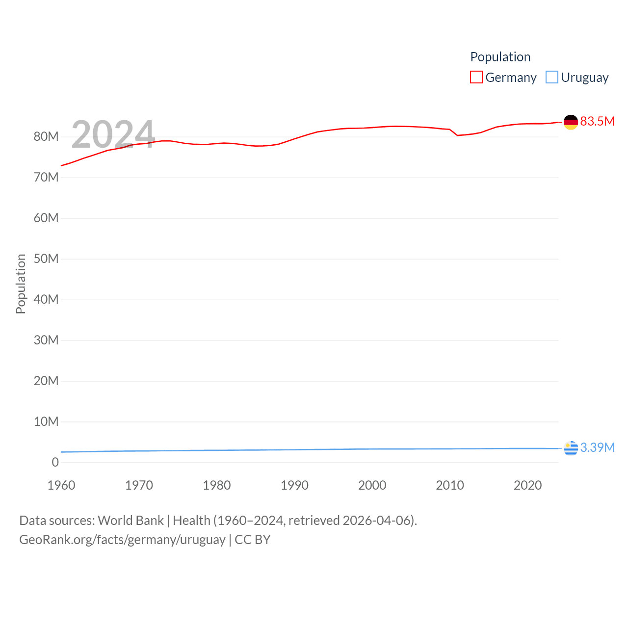 Germany has a population of 83.5M (ranked 19/197), compared with 3.39M in Uruguay (ranked 133/197). Germany's land area is 134,916 sq mi versus 67,576 sq mi for Uruguay (ranked 63rd vs. 89th).