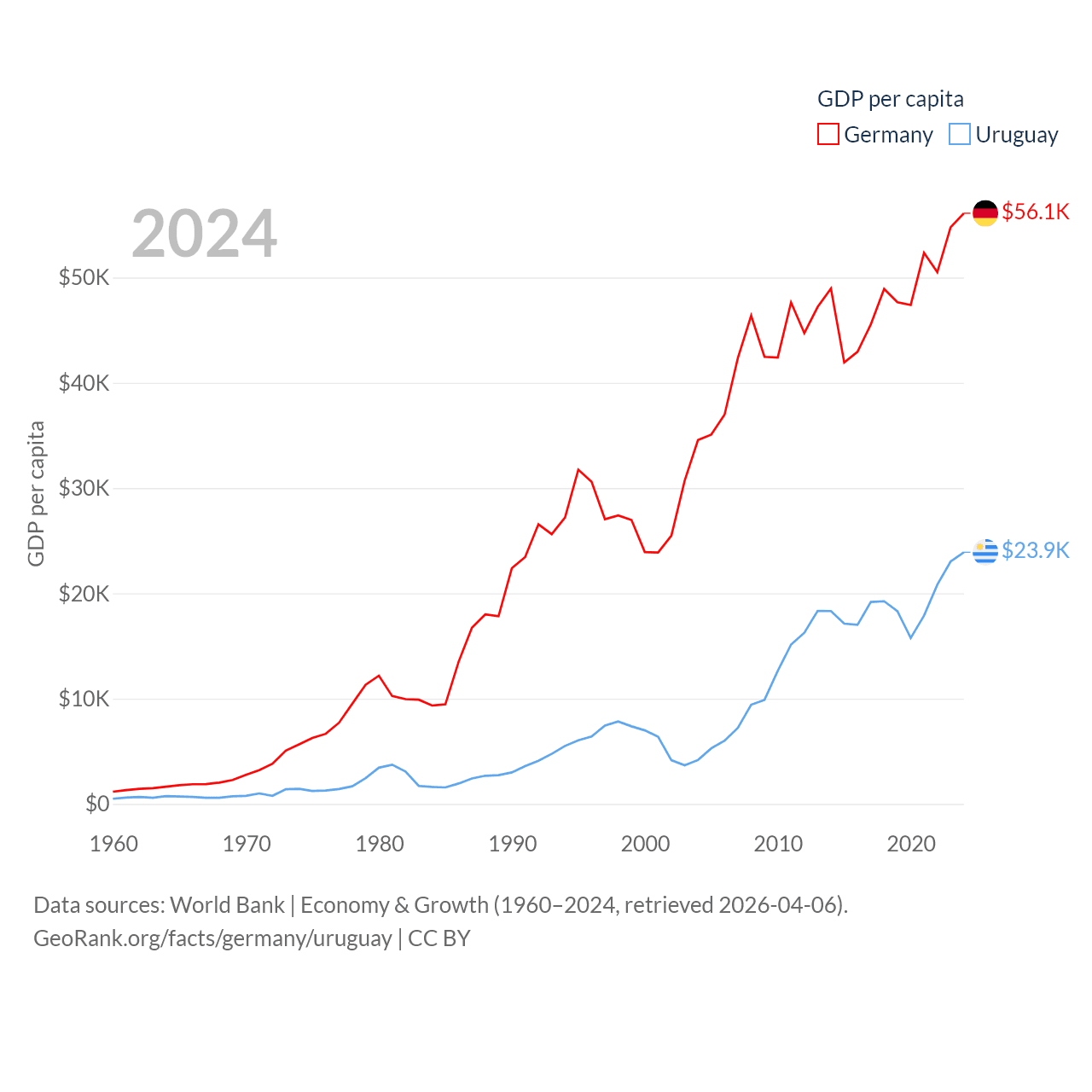 By GDP, Germany ranks 3/197 ($4.69T) and Uruguay ranks 81/197 ($81B). By GDP per capita, Germany ranks 19/197 ($56,104), while Uruguay ranks 52/197 ($23,907).