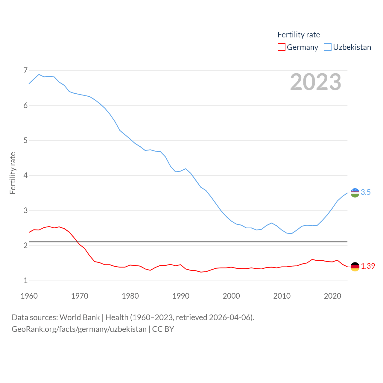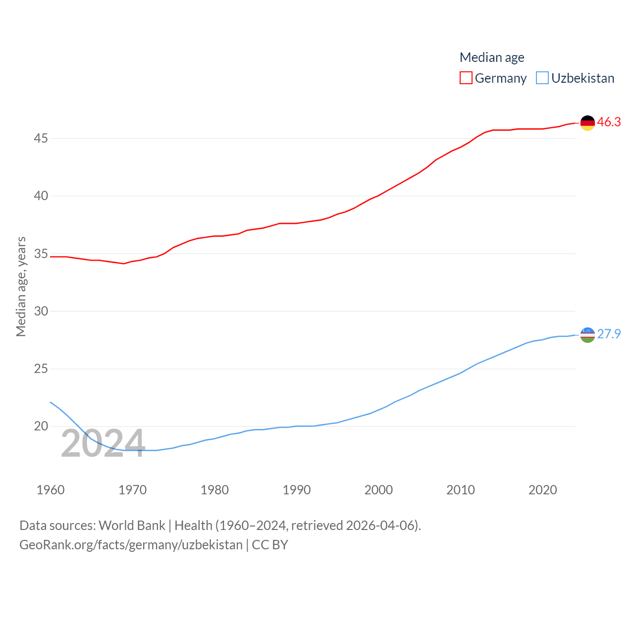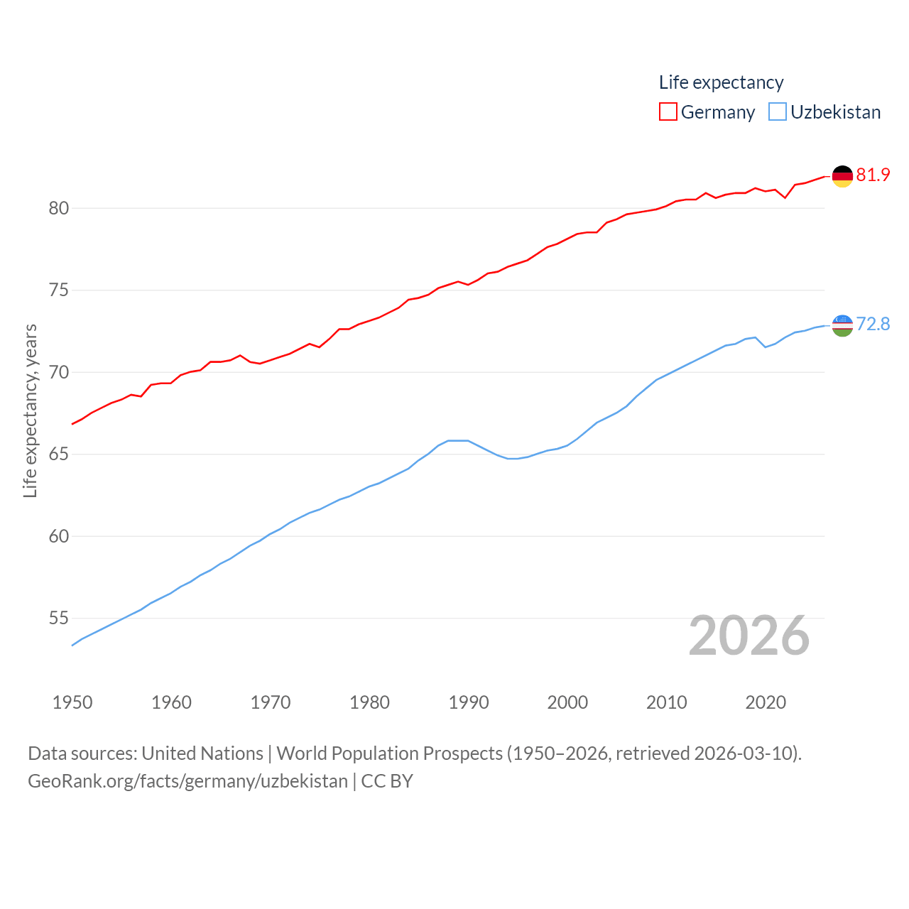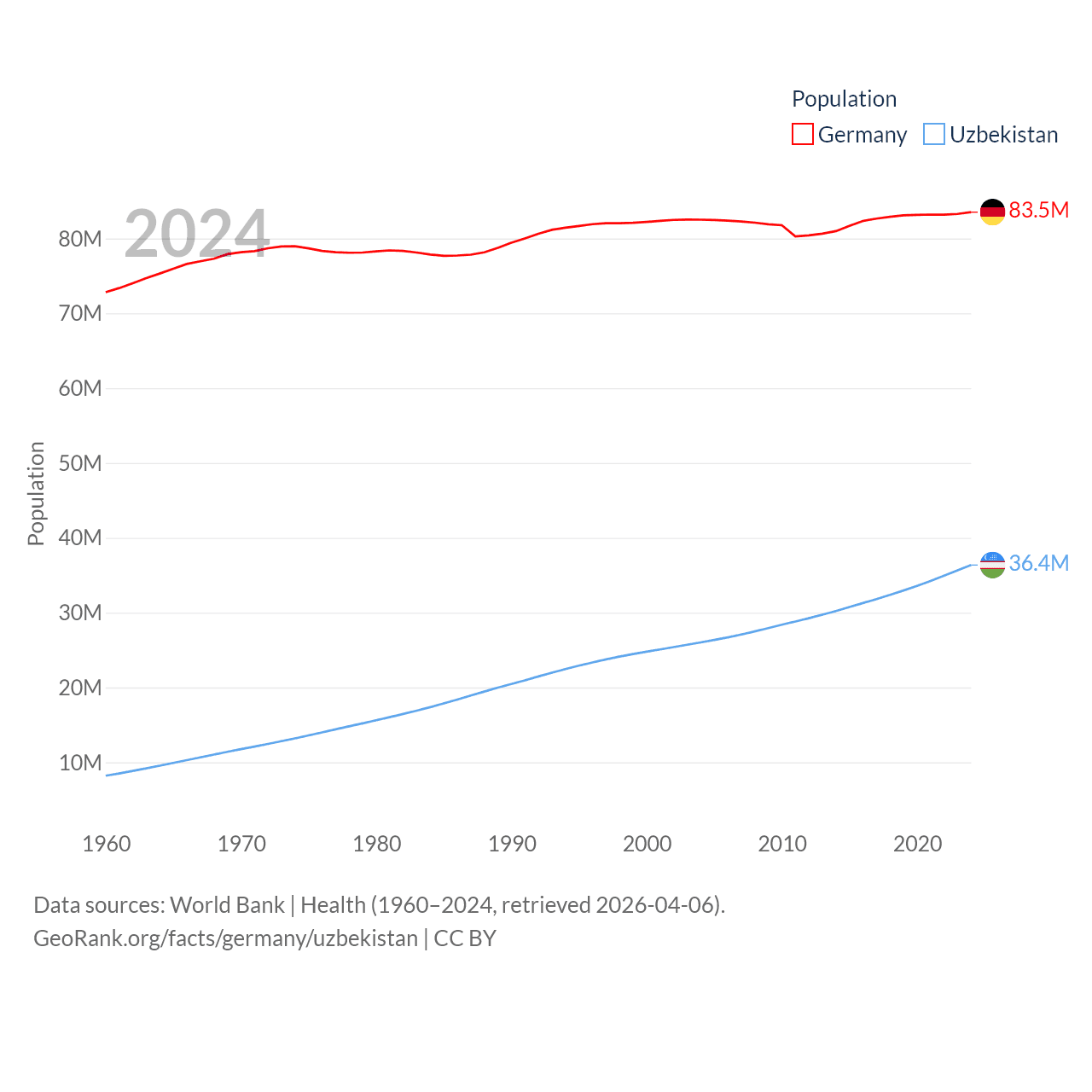 Germany has a population of 83.5M (ranked 19/197), compared with 36.4M in Uzbekistan (ranked 43/197). Germany's land area is 134,916 sq mi versus 170,136 sq mi for Uzbekistan (ranked 63rd vs. 56th).