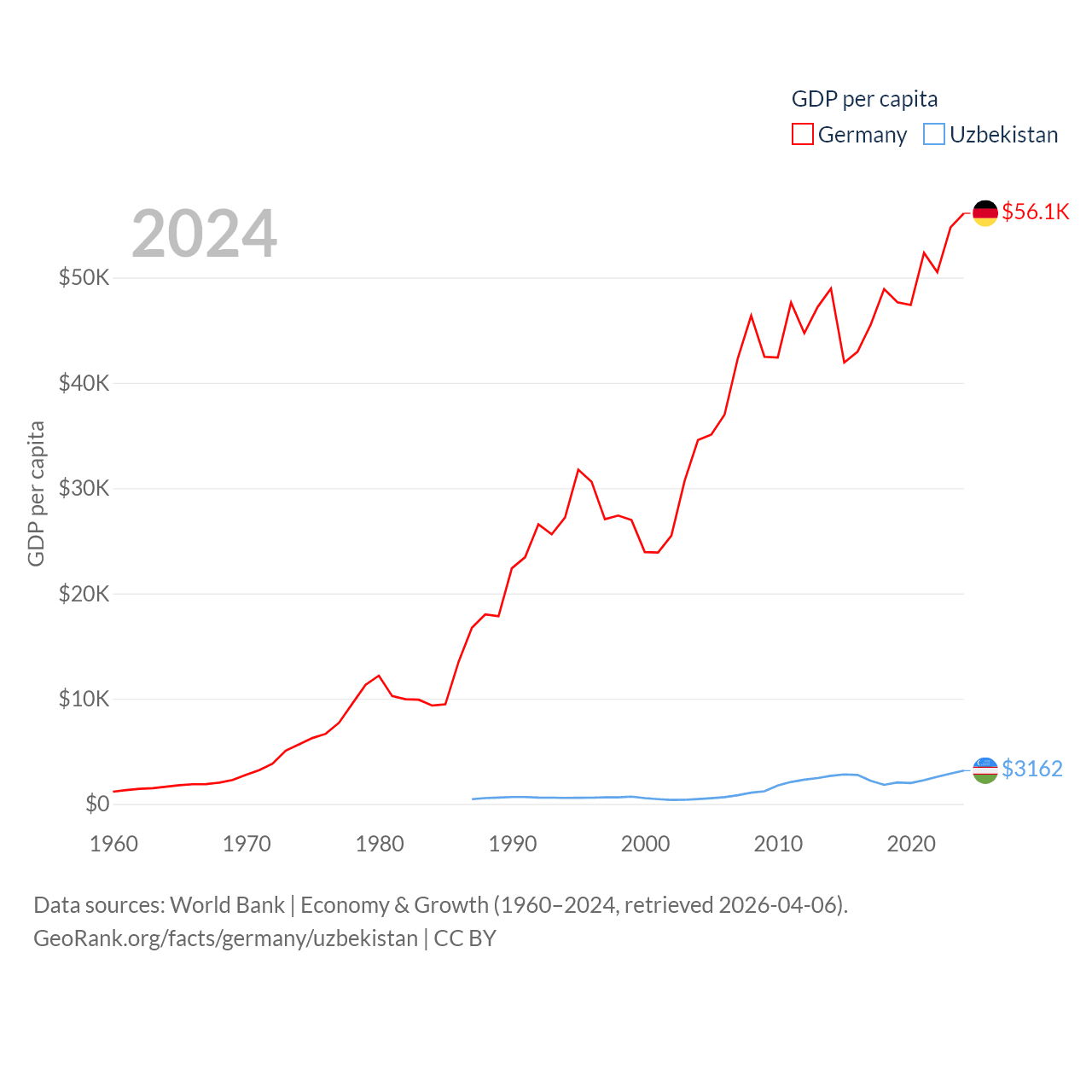 By GDP, Germany ranks 3/197 ($4.69T) and Uzbekistan ranks 66/197 ($115B). By GDP per capita, Germany ranks 19/197 ($56,104), while Uzbekistan ranks 139/197 ($3,162).