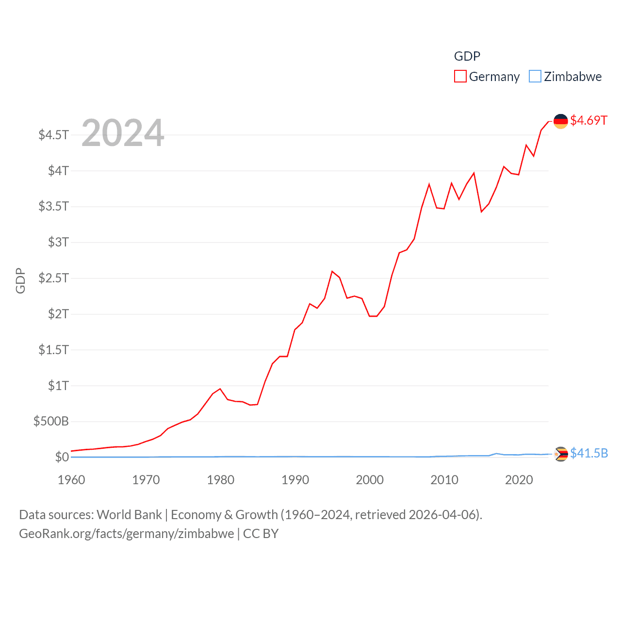 By GDP, Germany ranks 3/197 ($4.69T) and Zimbabwe ranks 102/197 ($41.5B). By GDP per capita, Germany ranks 19/197 ($56,104), while Zimbabwe ranks 148/197 ($2,497).