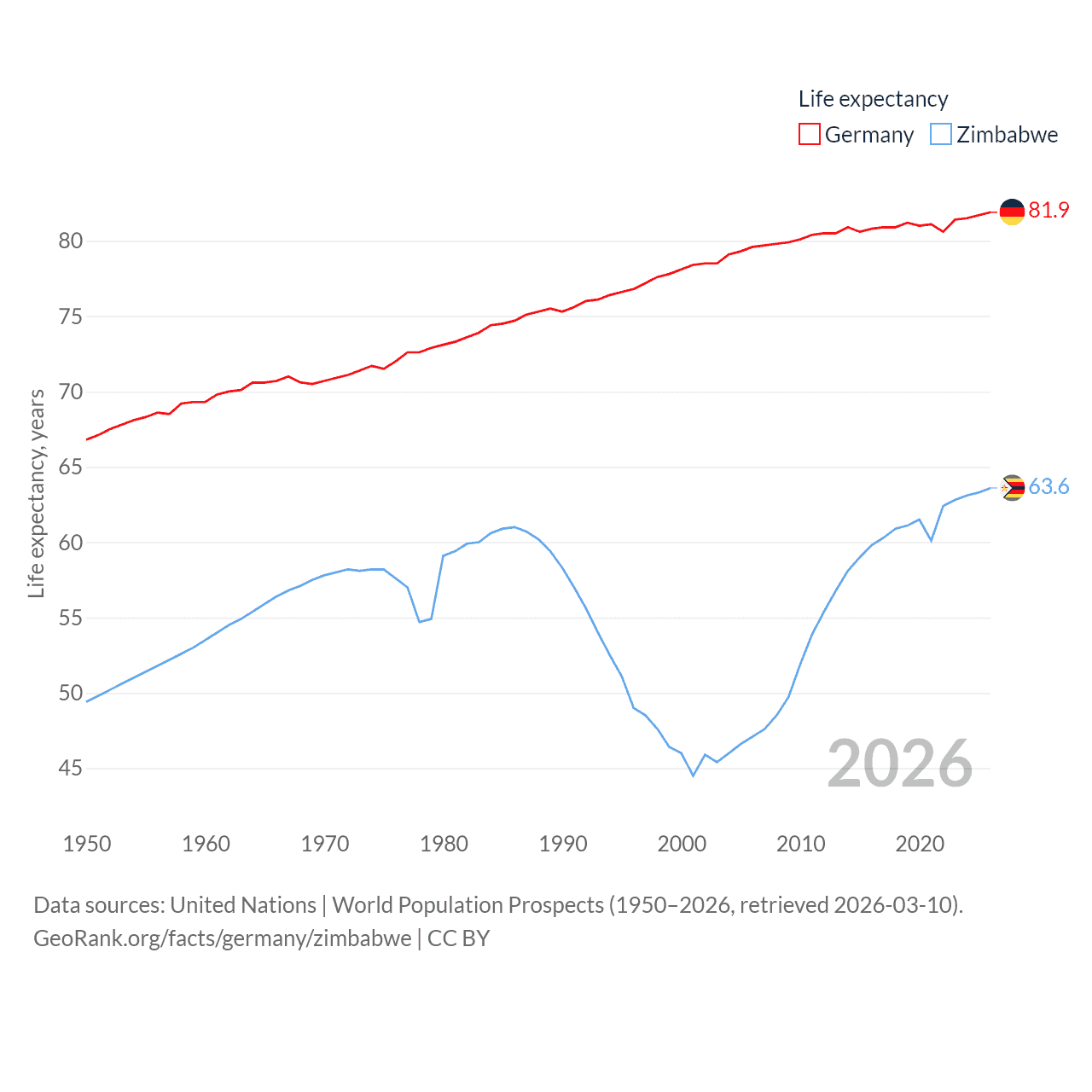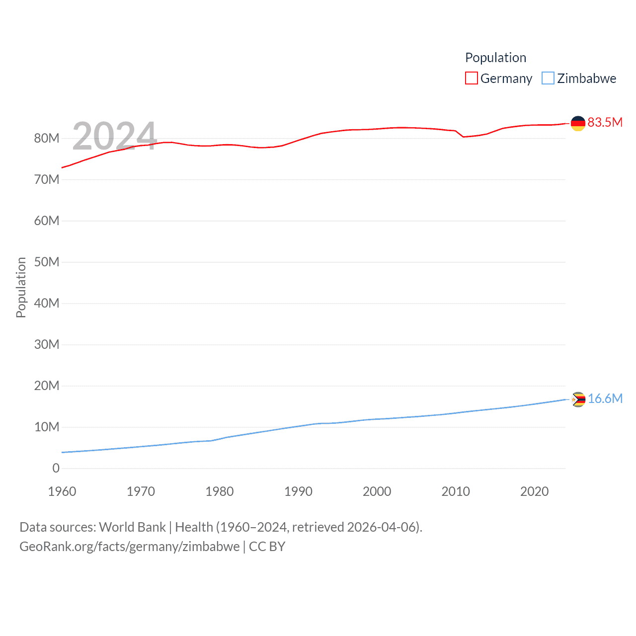 Germany has a population of 83.5M (ranked 19/197), compared with 16.6M in Zimbabwe (ranked 74/197). Germany's land area is 134,916 sq mi versus 149,364 sq mi for Zimbabwe (ranked 63rd vs. 60th).