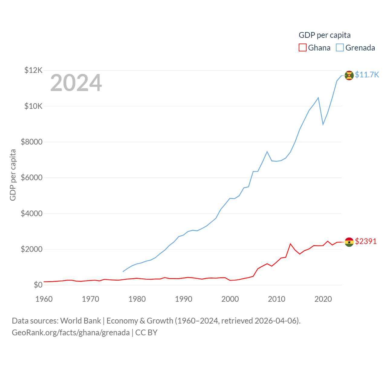 By GDP, Ghana ranks 80/197 ($82.3B) and Grenada ranks 184/197 ($1.37B). By GDP per capita, Ghana ranks 151/197 ($2,391), while Grenada ranks 80/197 ($11,705).