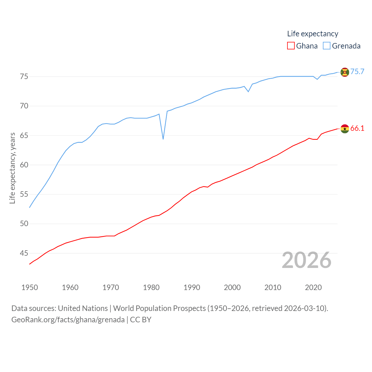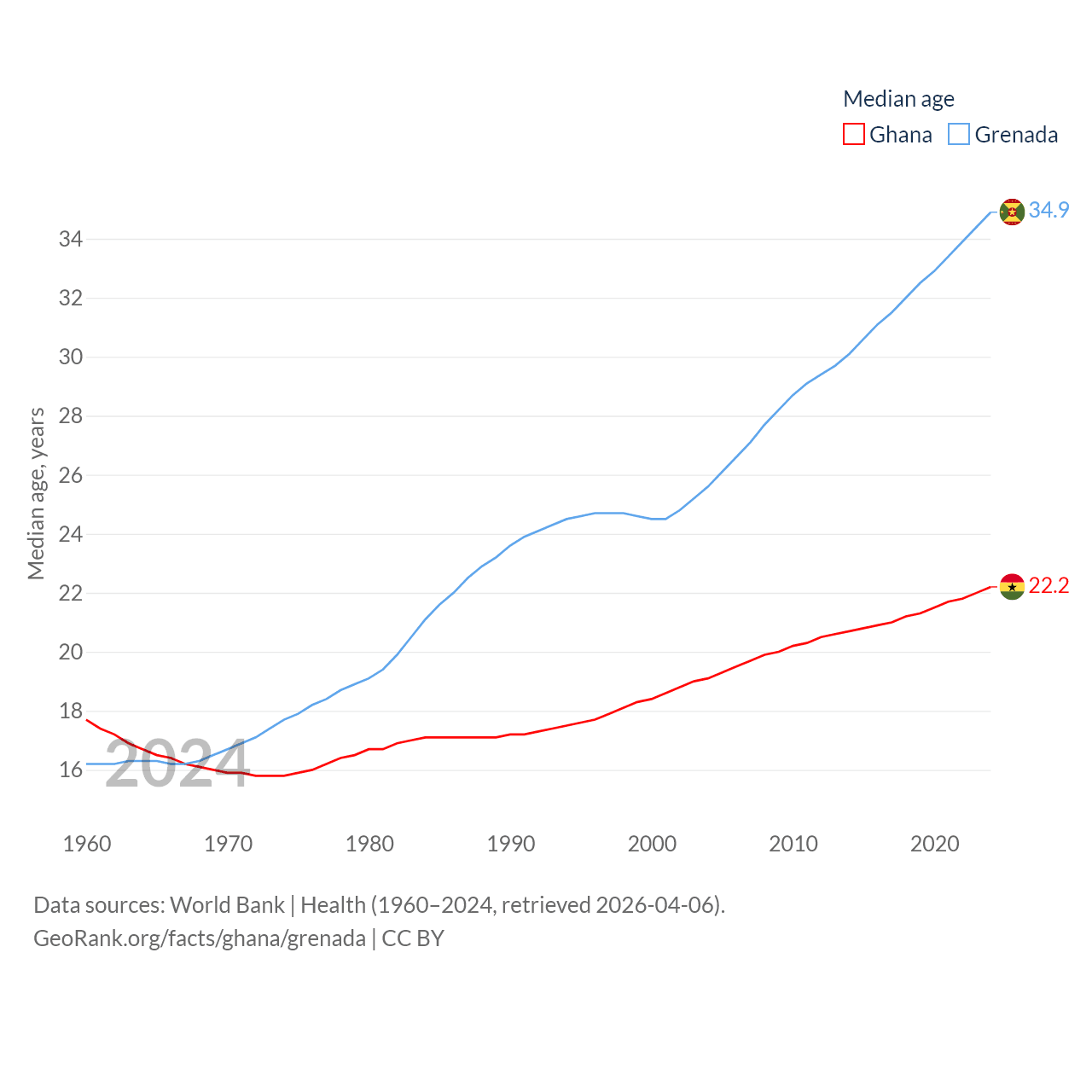 Ghana has a population of 34.4M (ranked 47/197), compared with 117K in Grenada (ranked 182/197). Ghana's land area is 87,851 sq mi versus 131.3 sq mi for Grenada (ranked 81st vs. 186th).