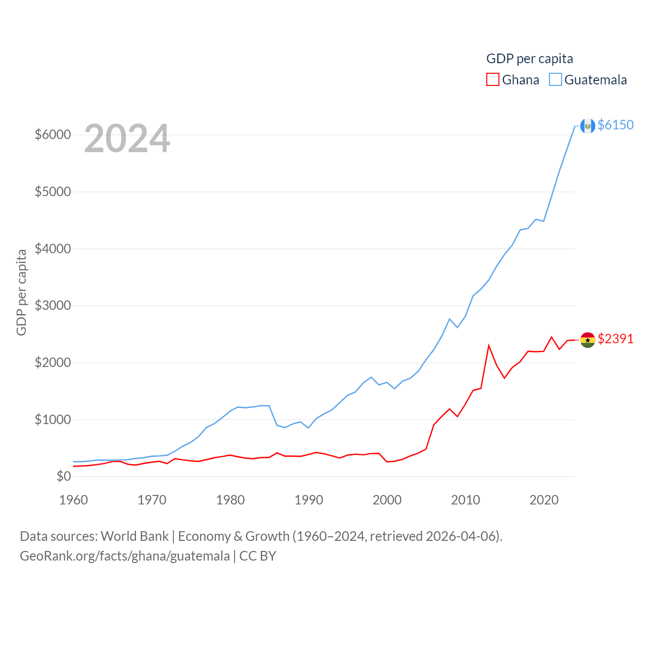 By GDP, Ghana ranks 80/197 ($82.3B) and Guatemala ranks 68/197 ($113B). By GDP per capita, Ghana ranks 151/197 ($2,391), while Guatemala ranks 112/197 ($6,150).