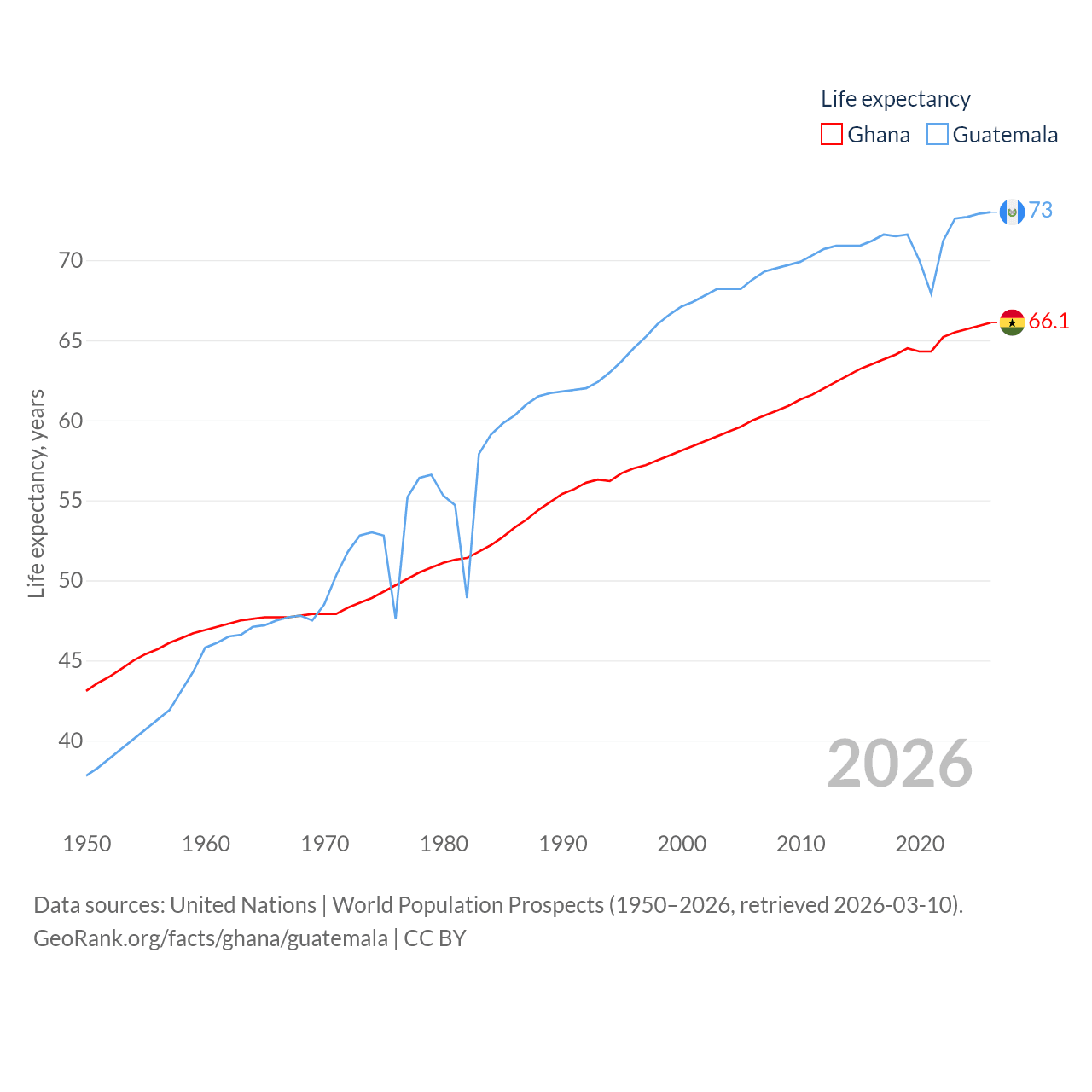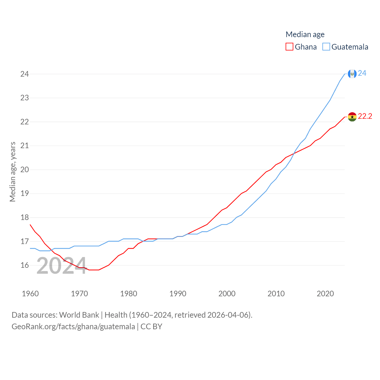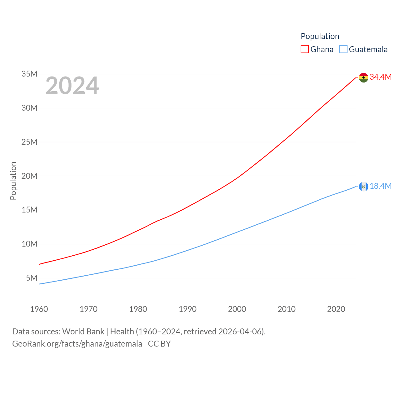 Ghana has a population of 34.4M (ranked 47/197), compared with 18.4M in Guatemala (ranked 70/197). Ghana's land area is 87,851 sq mi versus 41,375 sq mi for Guatemala (ranked 81st vs. 102nd).