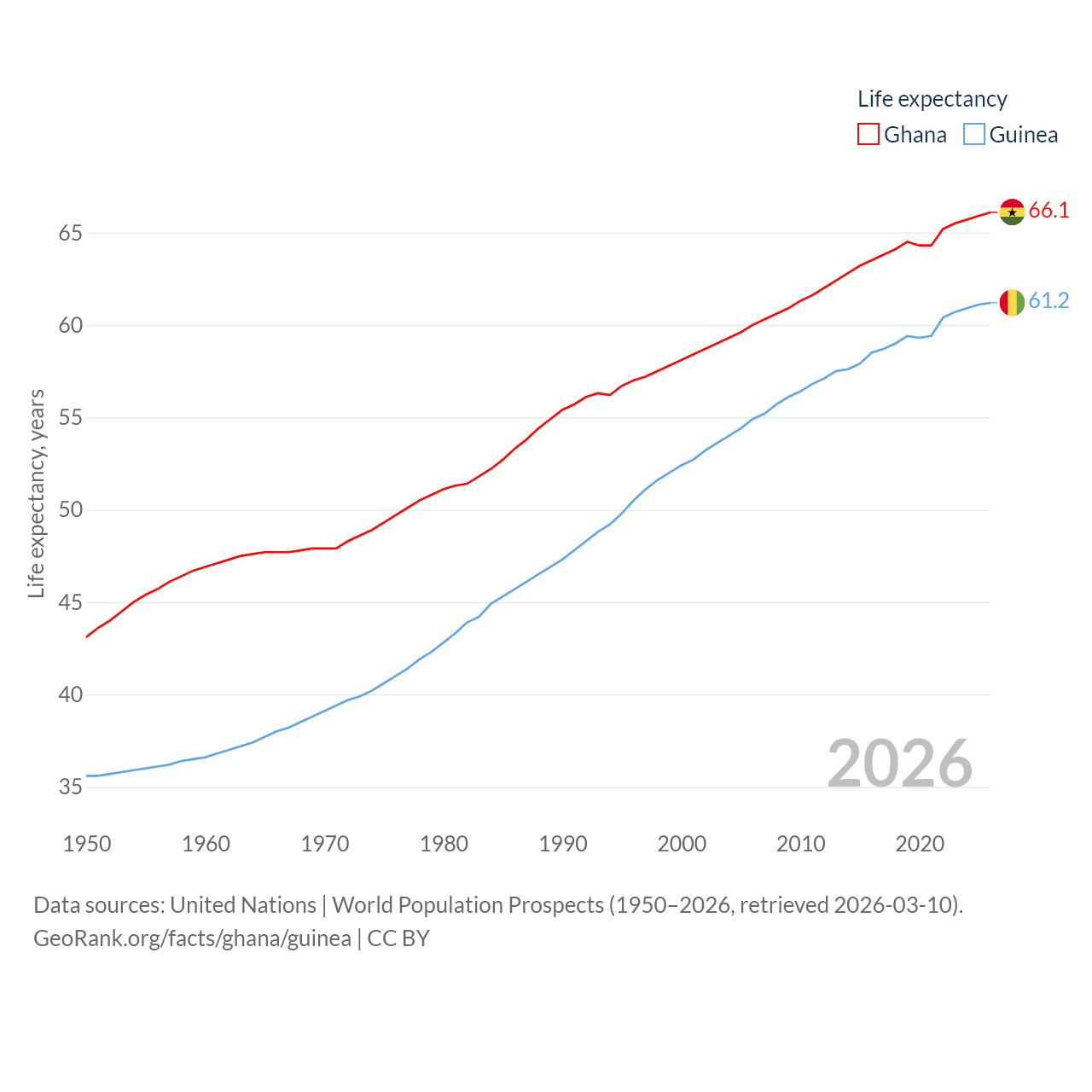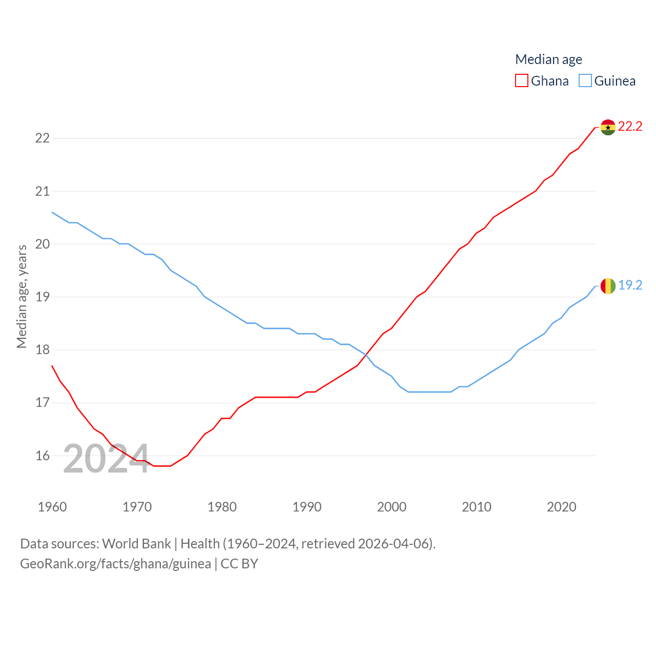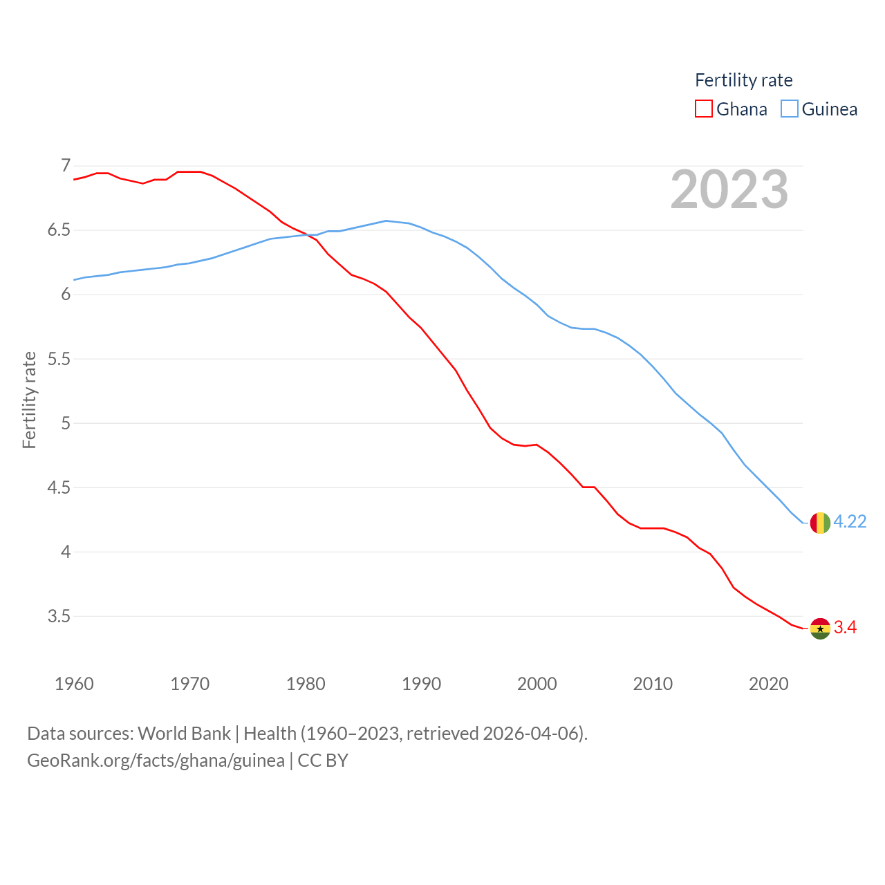 Ghana has a population of 34.4M (ranked 47/197), compared with 14.8M in Guinea (ranked 75/197). Ghana's land area is 87,851 sq mi versus 94,873 sq mi for Guinea (ranked 81st vs. 77th).