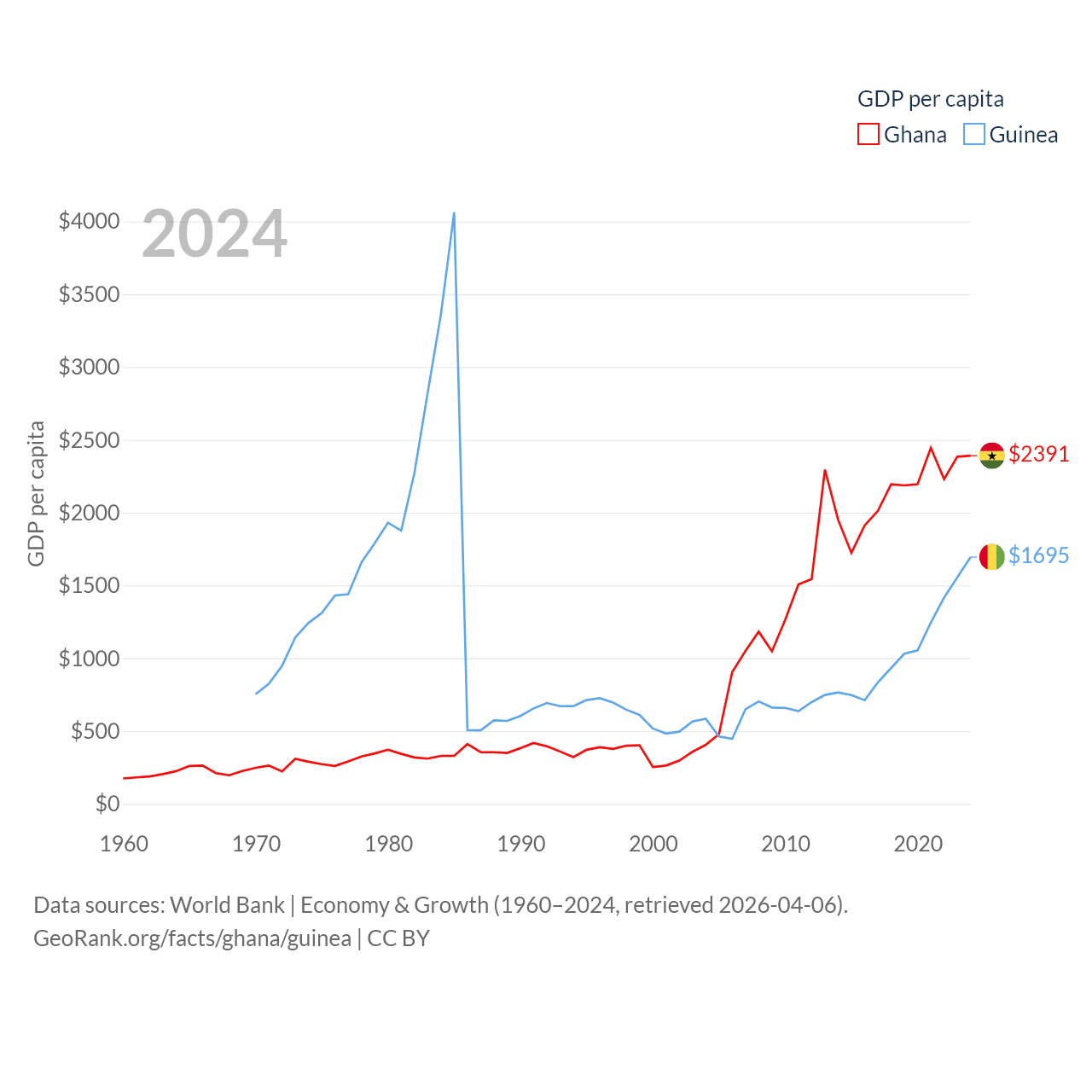 By GDP, Ghana ranks 80/197 ($82.3B) and Guinea ranks 118/197 ($25B). By GDP per capita, Ghana ranks 151/197 ($2,391), while Guinea ranks 160/197 ($1,695).